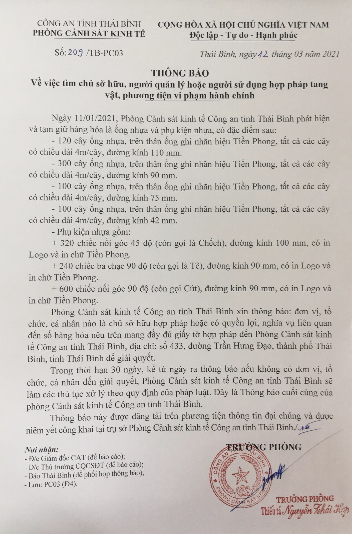 Ngày 12/3/2021, Phòng Cảnh sát Kinh tế, Công an tỉnh Thái Bình có Thông báo số 209/TB-PC03 về việc tìm chủ sở hữu, người quản lý hoặc người sử dụng hợp pháp tang vật, phương tiện vi phạm hành chính.