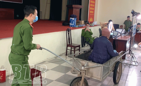 Cán bộ ,chiến sĩ công an huyện Đông Hưng hỗ trợ người cao tuổi đến nơi làm thủ tục cấp CCCD.