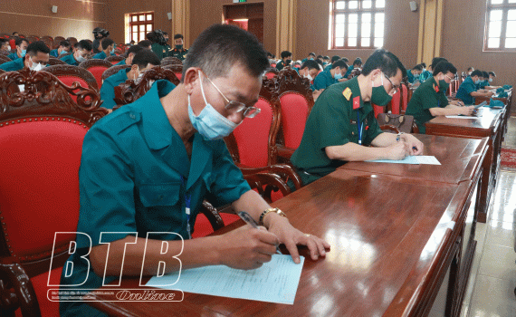 Các thí sinh làm phần thi trắc nghiệm nhận thức về Luật và các văn bản liên quan đến Luật Dân quân tự vệ.