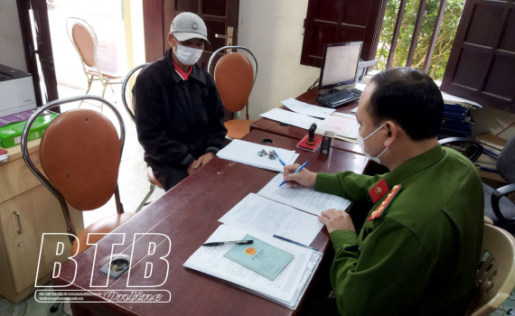 Công an thị trấn Hưng Nhân (Hưng Hà) xử phạt trường hợp không đeo khẩu trang tại nơi công cộng.
