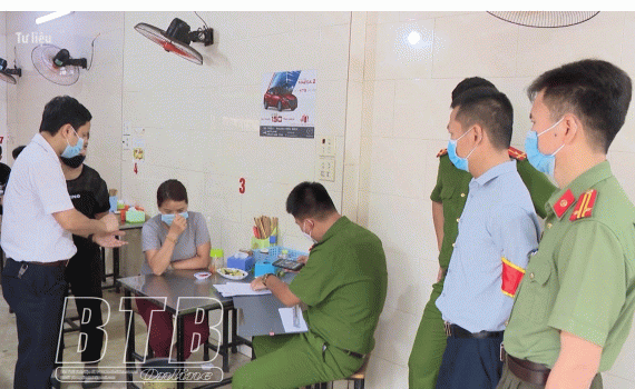 Lực lượng chức năng xử phạt hàng quán vi phạm quy định phòng, chống dịch Covid-19 trên địa bàn thành phố Thái Bình.