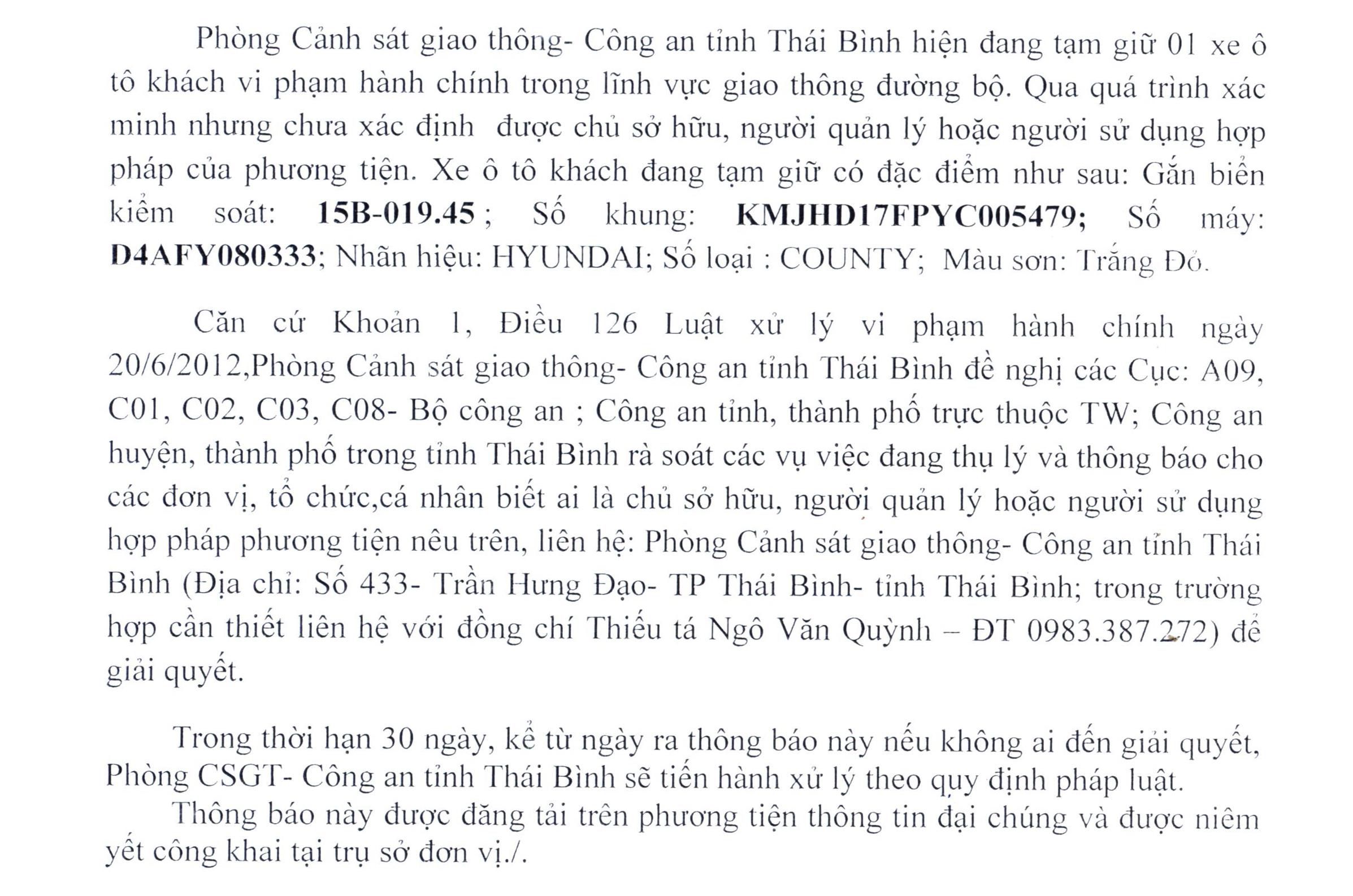 Thông báo về việc tìm chủ sở hữu, người quản lý hoặc người sử dụng hợp pháp tang vật, phương tiện vi phạm hành chính