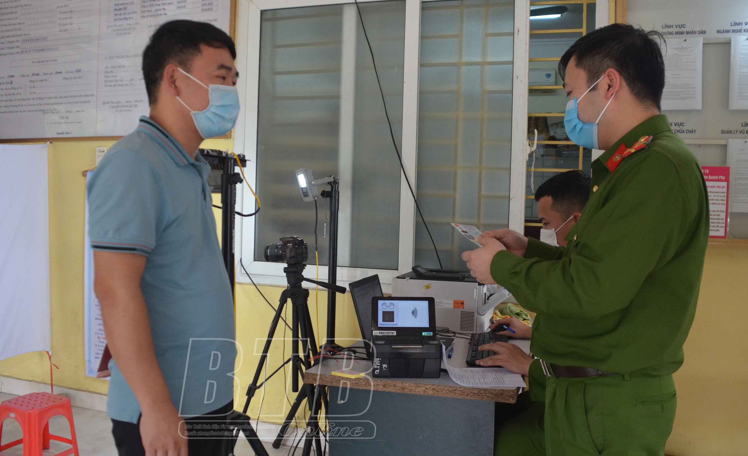 Cán bộ Đội Cảnh sát quản lý hành chính về trật tự xã hội, Công an huyện Quỳnh Phụ thực hiện việc cấp tài khoản định danh điện tử cho công dân.
