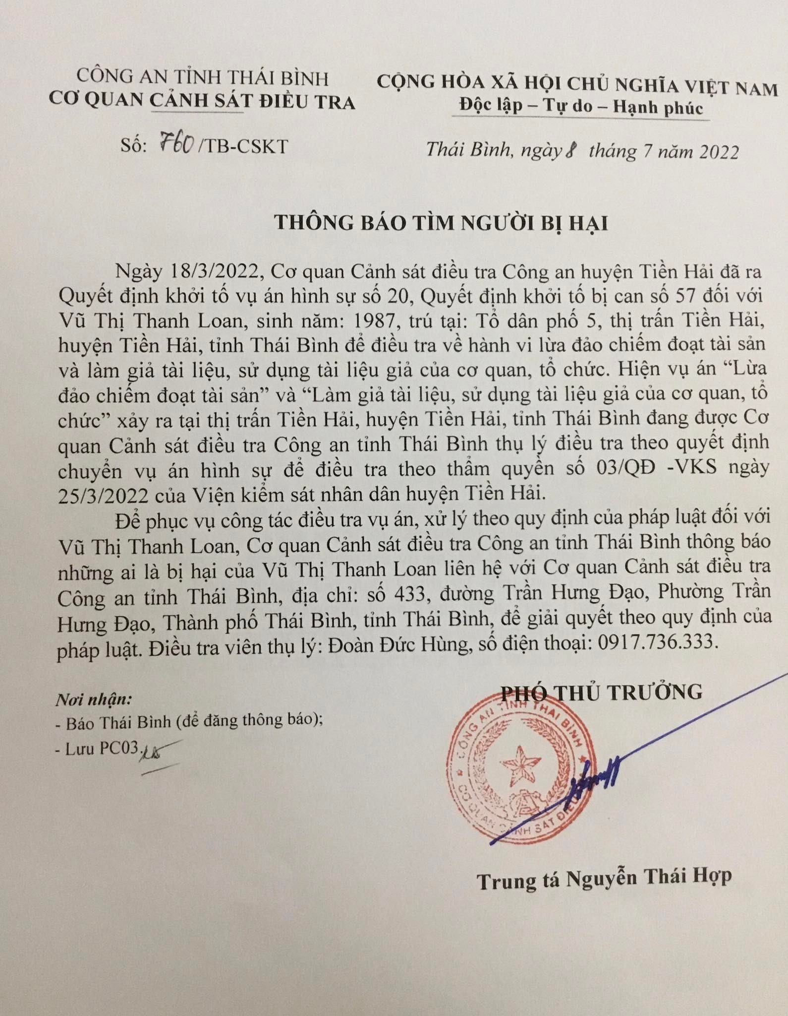 Thông báo tìm người bị hại
