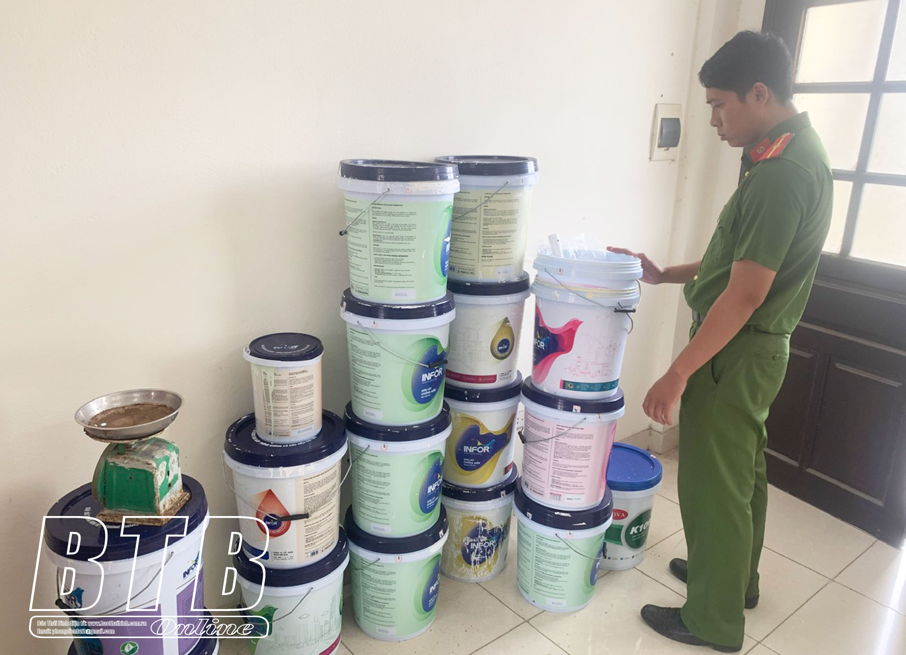Các thùng sơn giả bị Công an huyện Thái Thụy thu giữ.