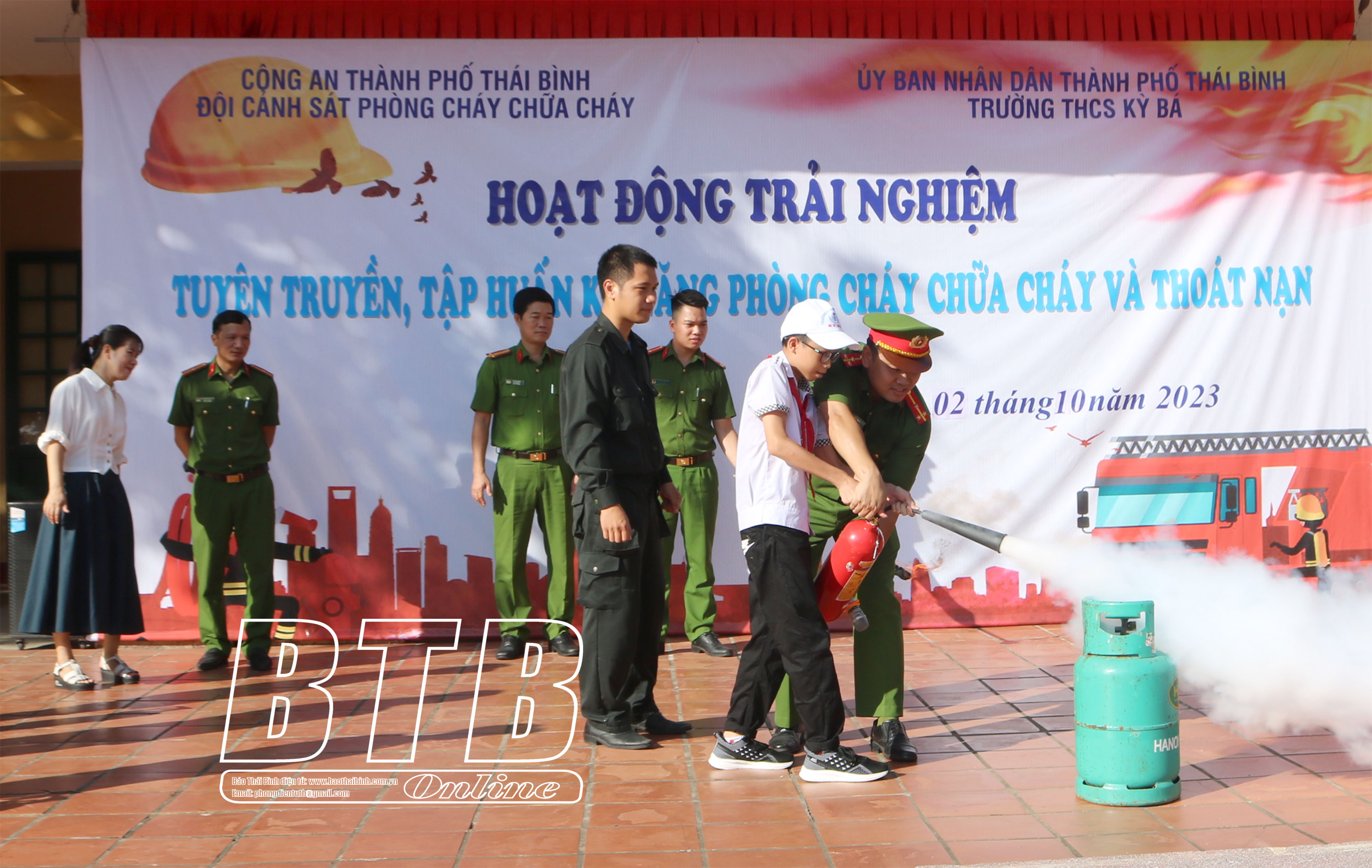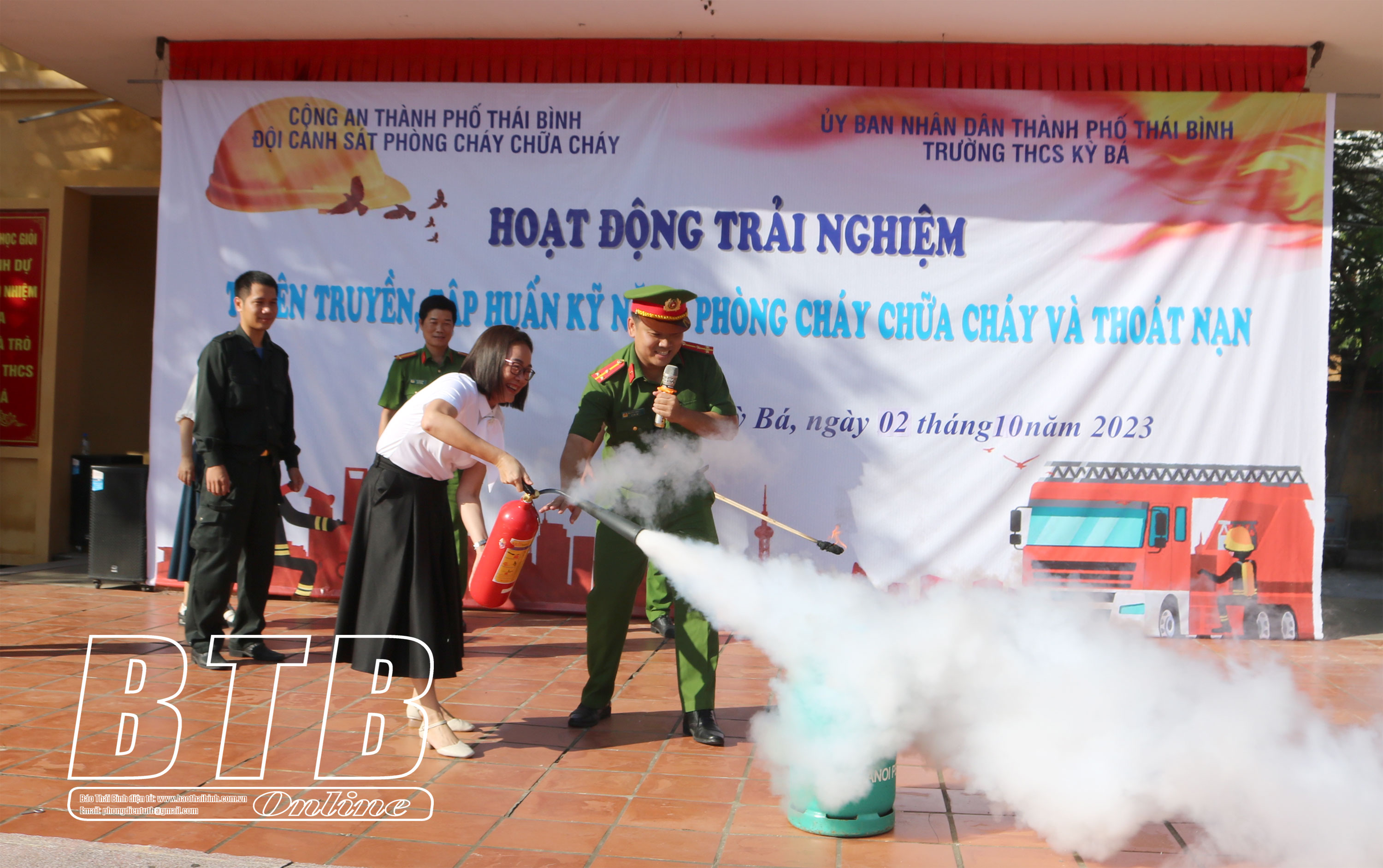 Học sinh Trường THCS Kỳ Bá (thành phố Thái Bình) thực hành sử dụng bình cứu hỏa để xử lý đám cháy.