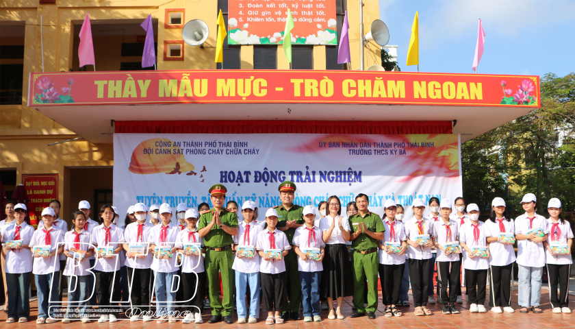 Lực lượng công an cấp phát cẩm nang phòng cháy, chữa cháy và cứu nạn, cứu hộ cho giáo viên và học sinh Trường THCS Kỳ Bá (thành phố Thái Bình).