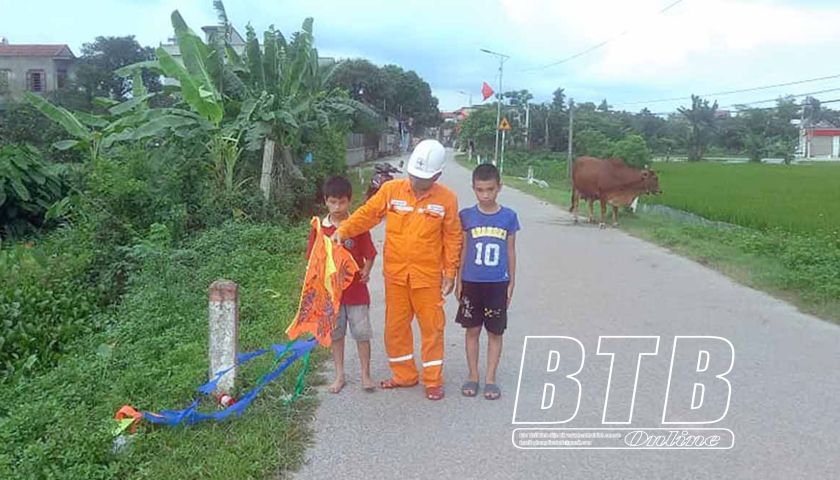 Công nhân ngành điện tuyên truyền để trẻ em không buông diều dưới hành lang lưới điện.