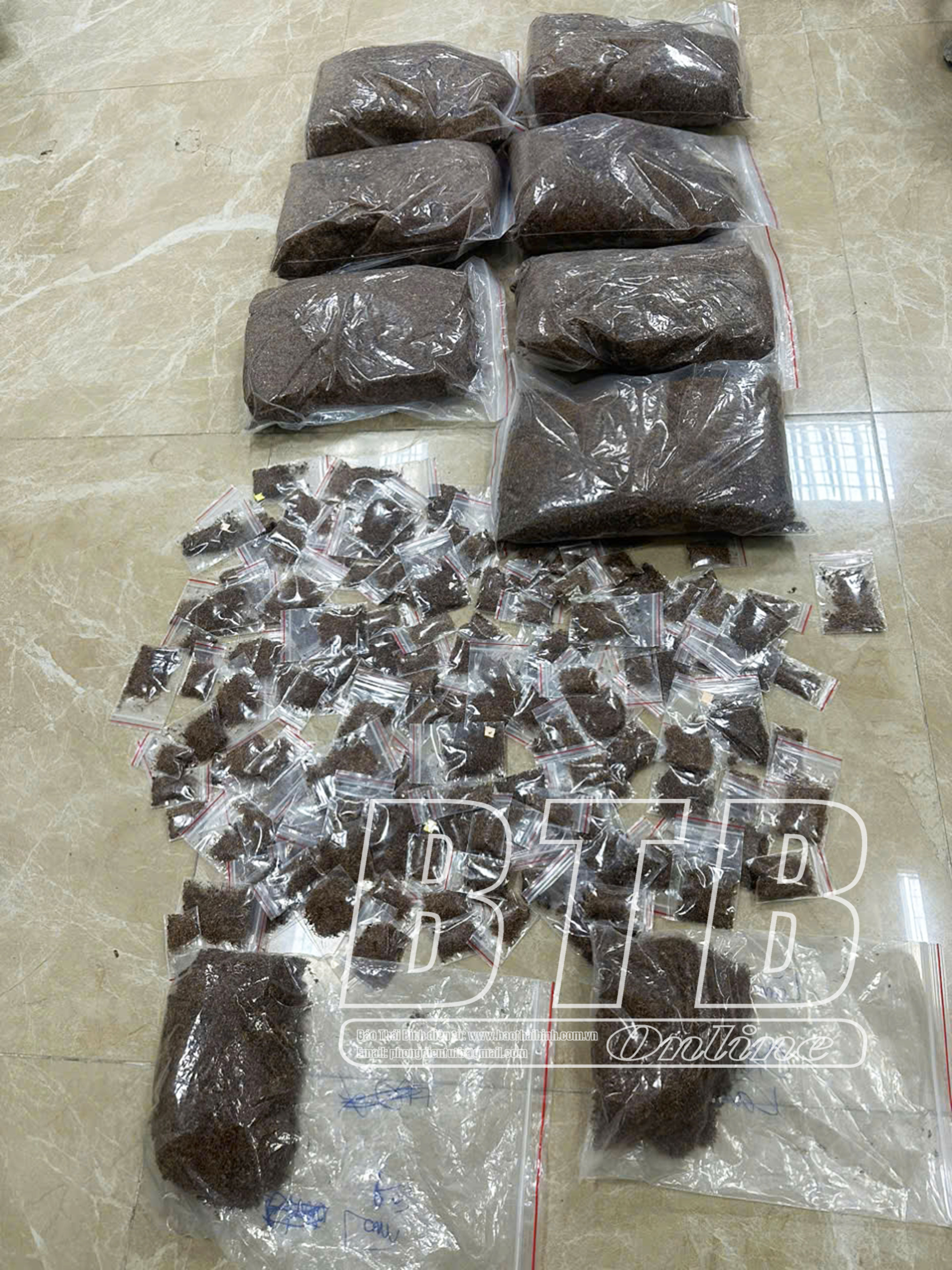 Cùng ngày, Công an phường Trần Hưng Đạo phối hợp với tổ công tác Đội Cảnh sát kinh tế - ma túy Công an thành phố và Công an phường Quang Trung tiến hành khám xét khẩn cấp chỗ ở của Đào Quốc Đạt tại số nhà 35, đường Phạm Thế Hiển, tổ 10, phường Trần Hưng Đạo thu giữ 2 túi ni lông trong suốt có mép cài viền màu đỏ, bên trong các túi đều có chứa sợi thực vật màu nâu vàng, 18 túi ni lông trong suốt, bên trong các túi đều có chứa sợi thực vật màu nâu vàng; 1 ống thựa màu trắng, hình tròn, bên trong có chứa dung dịch nước màu xanh, 1 hộp nhựa trong suốt hình chữa nhật bên trong có tổng cộng 18 điếu bằng giấy hình trụ tròn màu trắng, bên trong các điếu đều chưa sợi thực vật màu nâu vàng; 1.567 túi ni lông trong suốt có mép cài viền màu đỏ; 380 túi ni lông trong suốt, 2 chiếc cân, 2 máy cuốn thuốc lá màu xanh đen, 1 máy dập ép nhiệt màu xanh, 1 bình xịt nước màu xanh. Tổng khối lượng thu giữ khoảng 8,5kg nghi ma túy dạng thực vật (Tobaco).