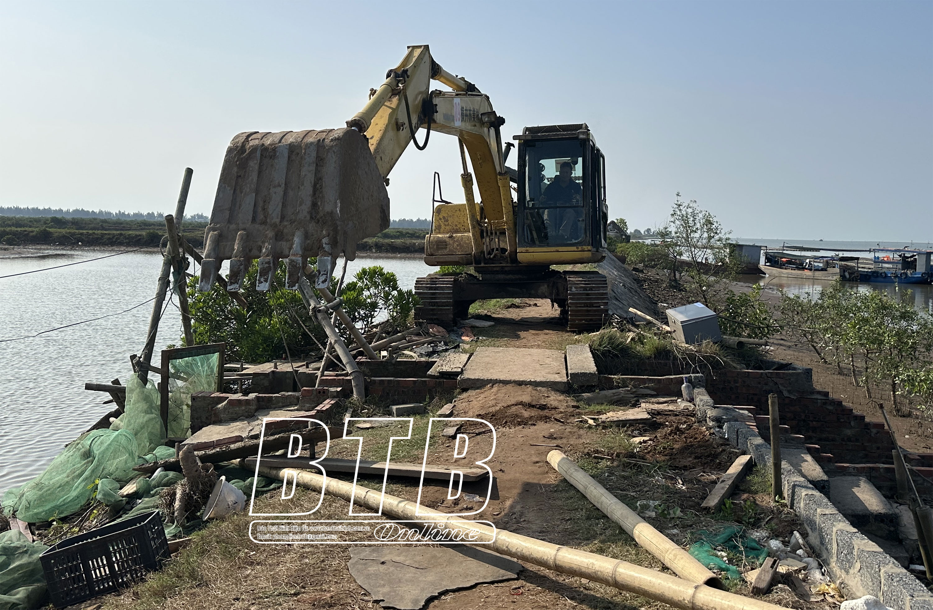 Huyện Tiền Hải huy động phương tiện tháo dỡ công trình vi phạm.