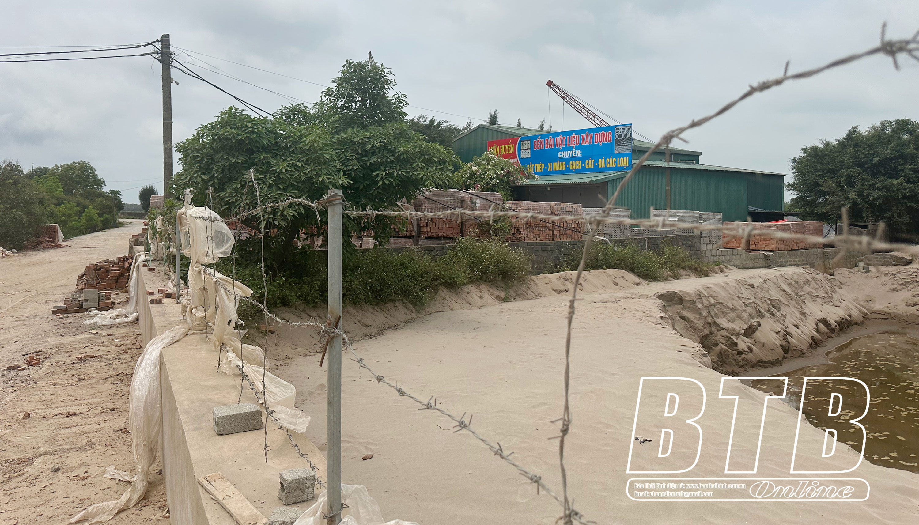 Mới đây, phóng viên đã có mặt tại khu vực cống Khổng, thuộc địa bàn thôn Tân Trào nhận thấy có 3 bến bãi trung chuyển, kinh doanh VLXD như gạch, đá, cát, xi măng nằm sát tường bao tuyến đê biển số 6. Phía bên trong các bãi này, ngoài những đống cát được chất cao còn có những công trình nhà xưởng, lán trại và các phương tiện ô tô tải, máy móc phục vụ việc bốc dỡ, chở VLXD. Trên mặt đê biển số 6 đoạn qua những bến bãi này có những lớp đất cát dày đặc mỗi khi có phương tiện đi qua gây khói bụi mù mịt, trong khi phía trong đê là nơi sinh sống, sinh hoạt của người dân thôn Tân Trào. Trên bức tường bao của tuyến đê biển số 6, các hộ kinh doanh bến bãi còn vây hàng rào dây thép gai cả 1 đoạn dài hàng chục mét. Ngay sát chân đê chất tải cát và gạch gây ảnh hưởng đến an toàn của tuyến đê biển.