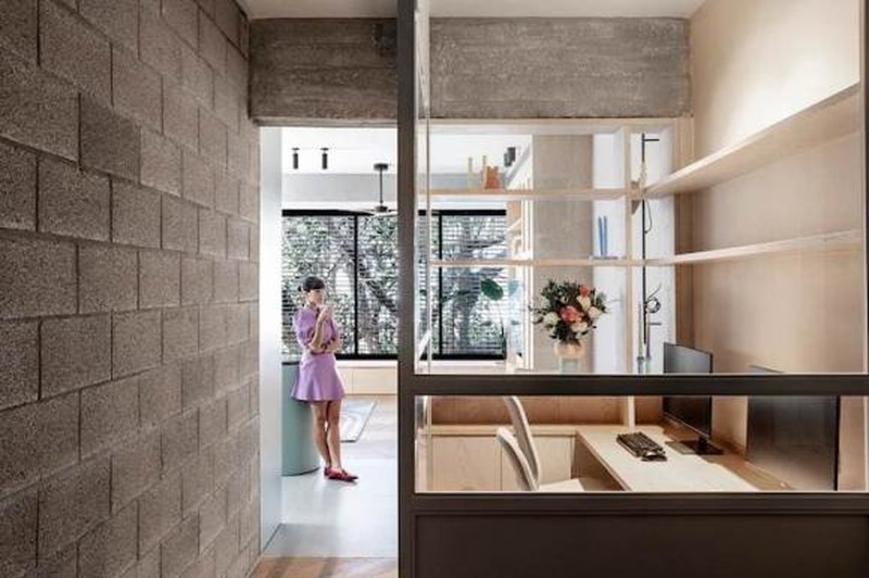 Vị trí lối đi bên hông quán không lãng phí, làm phòng học dạng kính, bên trong đặt bàn ghế máy vi tính, để phòng làm việc tại gia yên tĩnh không bị quấy rầy, không có nhu cầu lo lắng về ánh sáng. Bức tường gần bên bàn ăn được làm thành dạng tủ để tăng không gian lưu trữ.