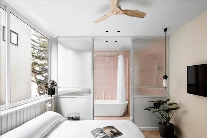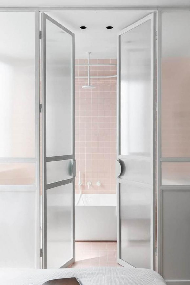 Ngoài ra, một cửa kính toàn bộ được lắp đặt giữa phòng ngủ chính và phòng tắm, vật liệu mờ che phủ sự riêng tư và truyền ánh sáng.