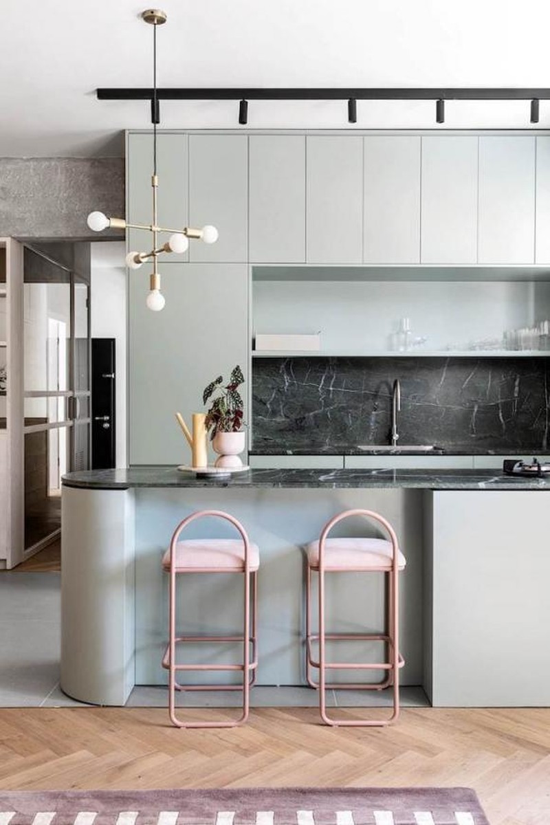 Vách ngăn phòng bếp được loại bỏ, thiết kế mở giúp không gian bên trong rộng rãi và sáng sủa hơn, ngoài bàn điều khiển bếp và tủ lưu trữ được thiết kế dựa vào tường, một hòn đảo độc lập được bổ sung làm vách ngăn, bày biện và khu vực nấu ăn cũng được thêm vào.