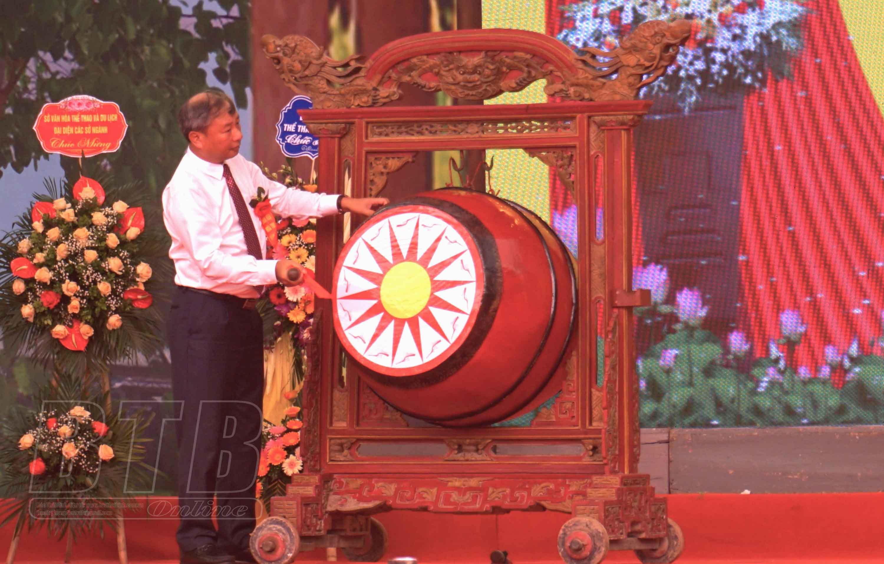 Đồng chí Nguyễn Quang Anh, Tỉnh ủy viên, Bí thư Huyện ủy Vũ Thư đánh trống khai mạc lễ hội chùa Keo mùa thu 2022.