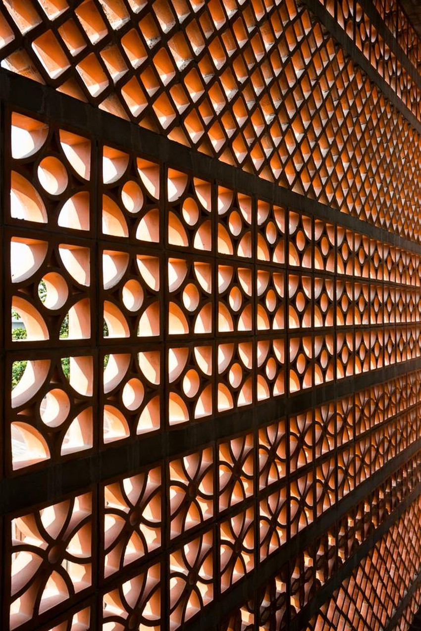 Công trình khác biệt bởi việc phối hợp hoa văn của gạch bằng đất nung khác nhau để tạo nên một mặt tiền bằng kiến trúc tổ mối.