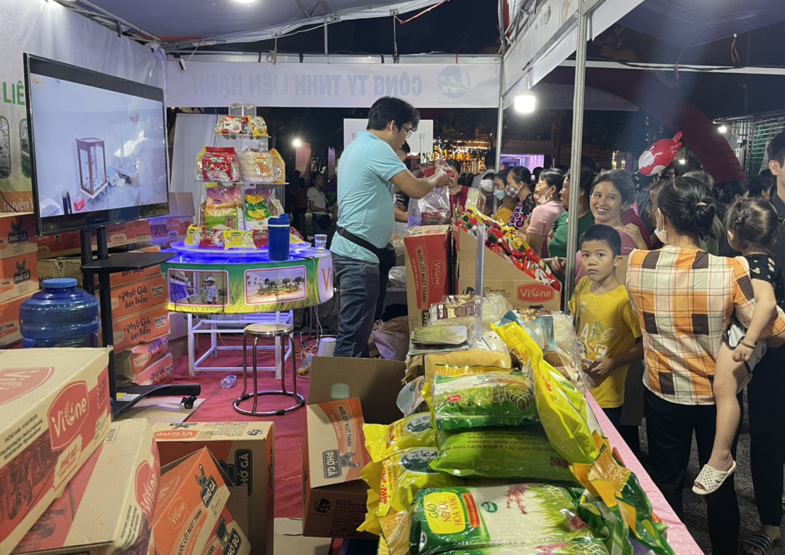 Đông đảo người dân tham quan gian hàng và mua sắm các sản phẩm gạo, bún tươi, bún, khở khô và phở ăn liền ViOne của Công ty TNHH Liên Hạnh tại chương trình đưa hàng Việt về thông thôn.