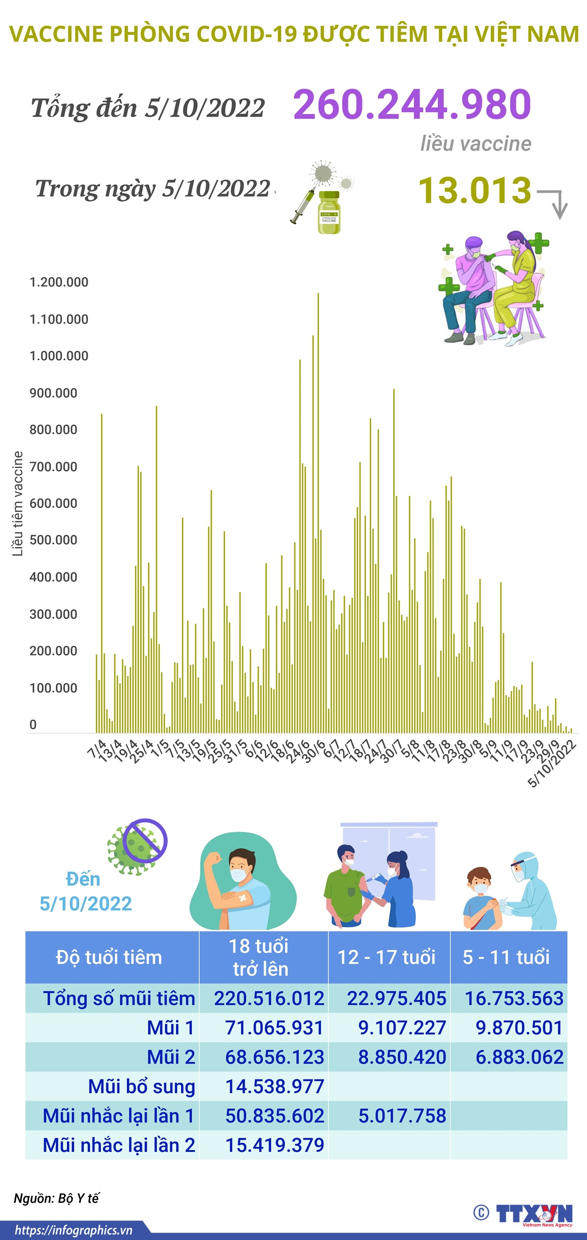 Trong ngày 5/10/2022 có 13.013 liều vaccine phòng COVID-19 được tiêm. Như vậy, tổng số liều vaccine đã được tiêm tại Việt Nam là 260.244.980 liều trong đó tiêm cho trẻ từ 5-11 tuổi là 16.753.563 liều, tiêm cho trẻ từ 12-17 tuổi là 22.975.405 liều và tiêm cho người từ 18 tuổi trở lên là 220.516.012 liều.