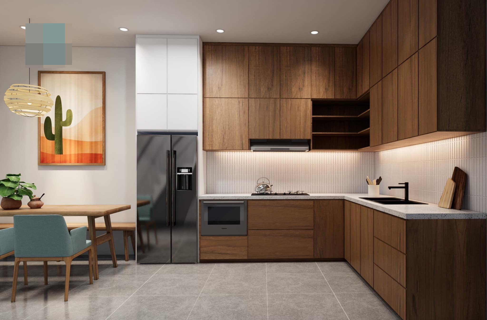 Khu bếp chữ L rộng rãi, cho gia chủ thỏa sức bày biện và chế biến món ngon.