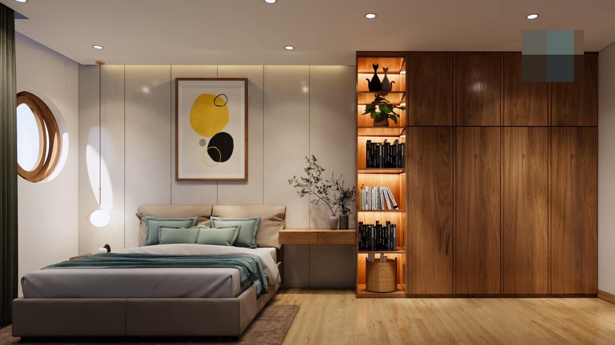 Phòng ngủ nhìn ra ngoài đường. Kiến trúc sư dùng cửa sổ tròn với cánh xoay độc đáo. Hệ tủ và tab liền khối giúp tiết kiệm diện tích.
