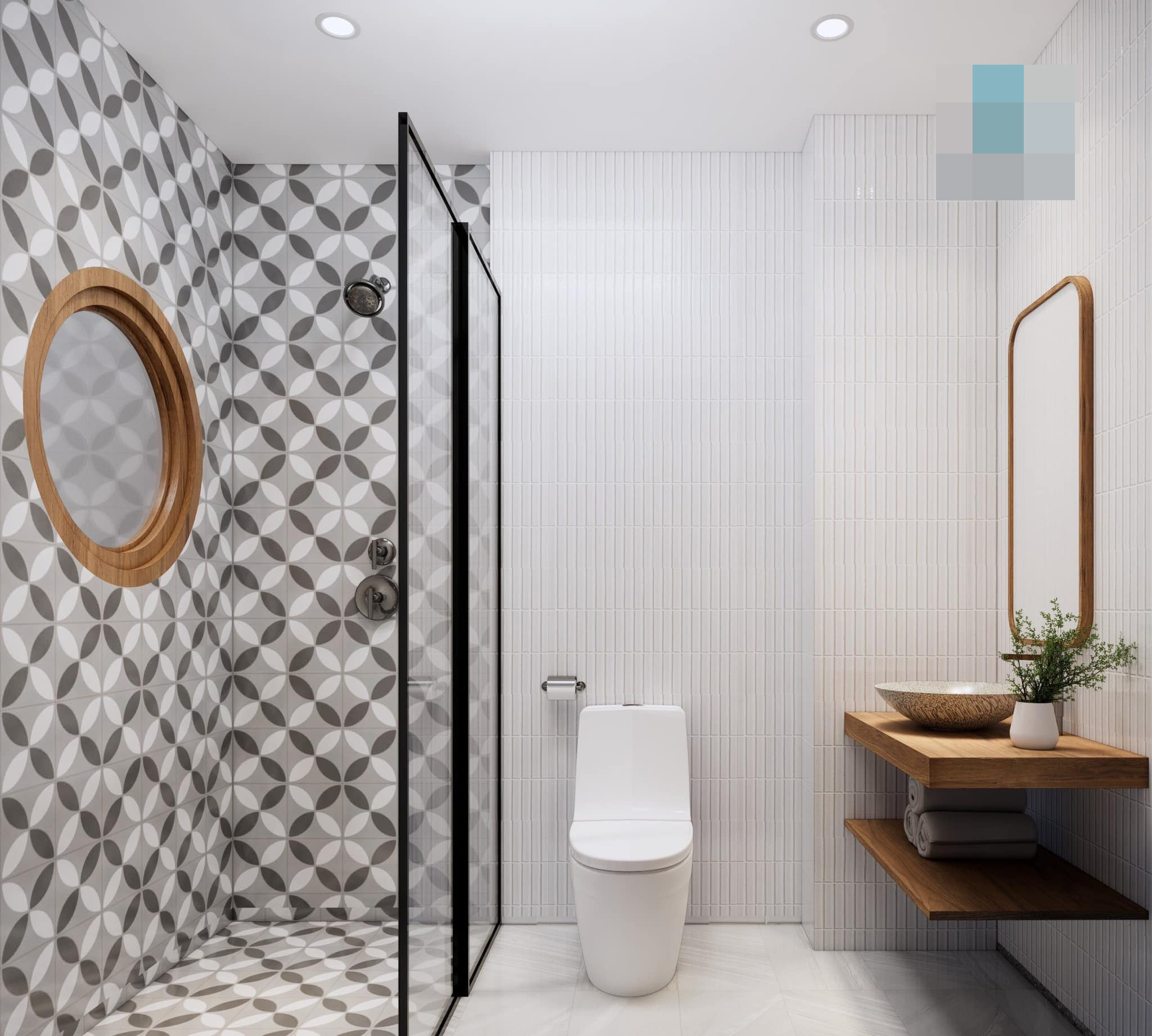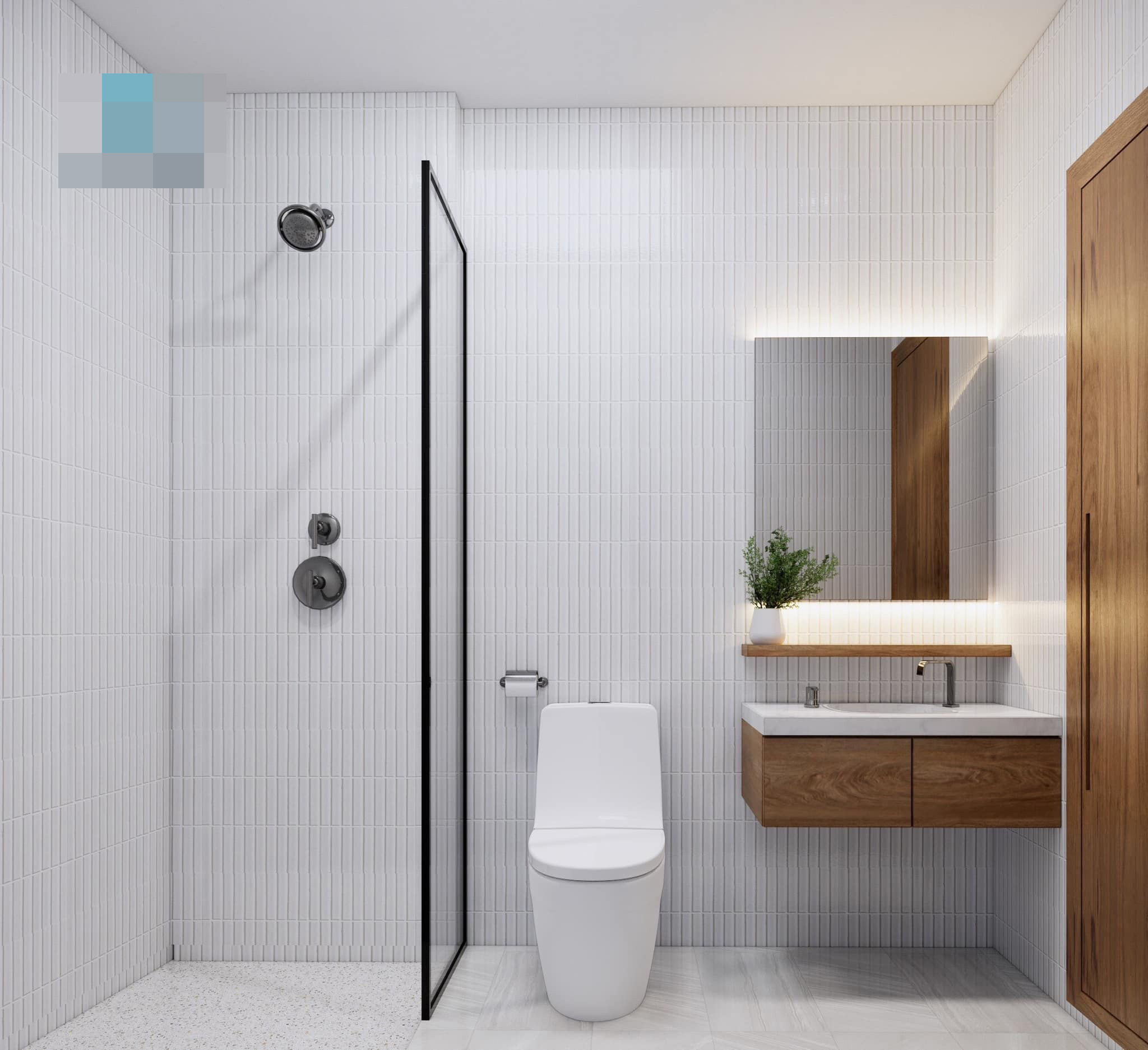 Hai khu vệ sinh trẻ trung, hiện đại dùng gam màu sáng, dễ lau dọn. Những chậu cây nhỏ xinh trên bồn rửa mặt làm tăng sinh khí, hút mùi cho phòng.