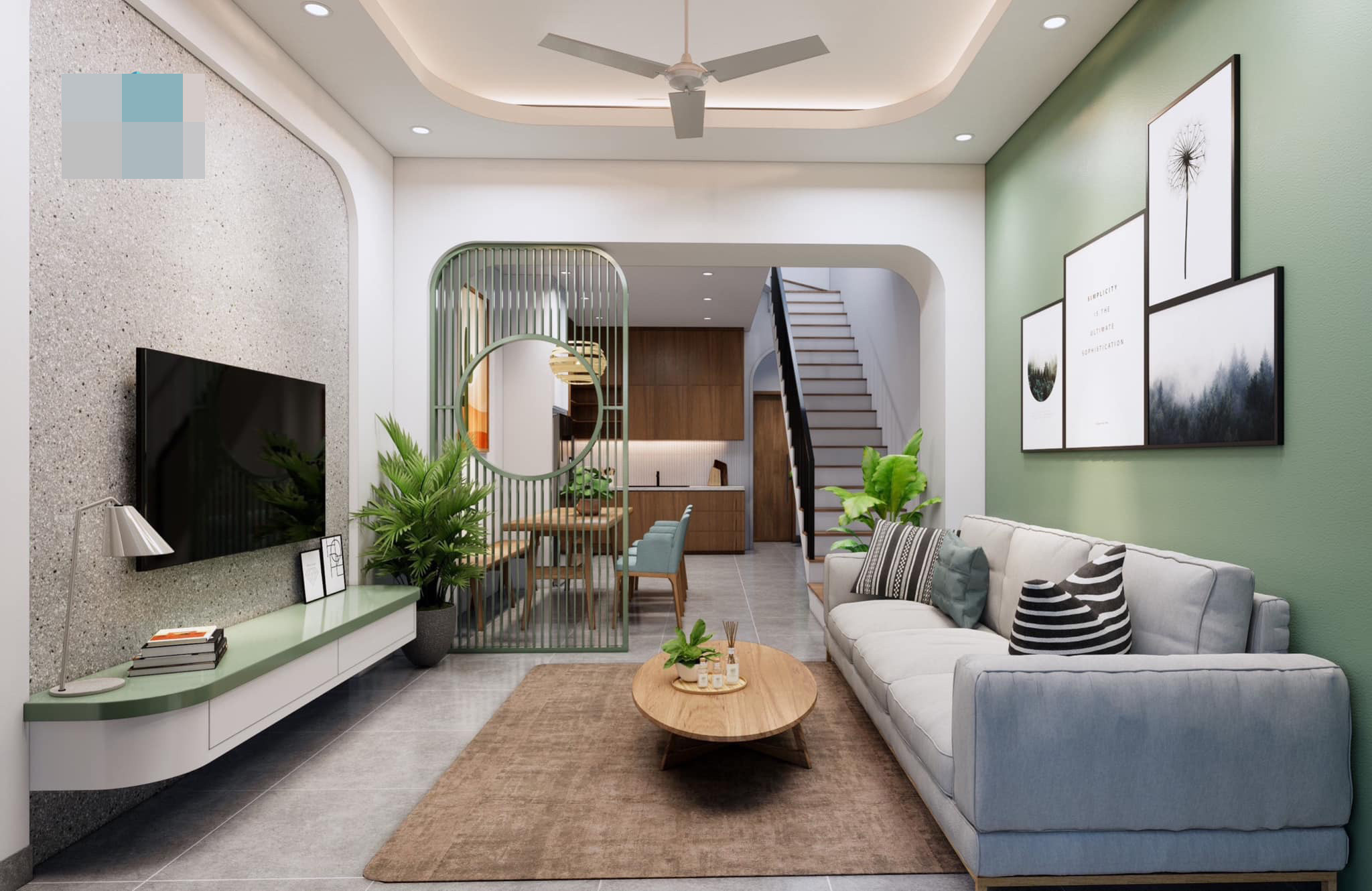 Phòng khách và bếp thông suốt, chỉ ngăn bằng bức vách lam gỗ màu xanh lá dịu mát. Cách thiết kế không gian mở như vậy giúp nhà rộng hơn về mặt cảm quan.