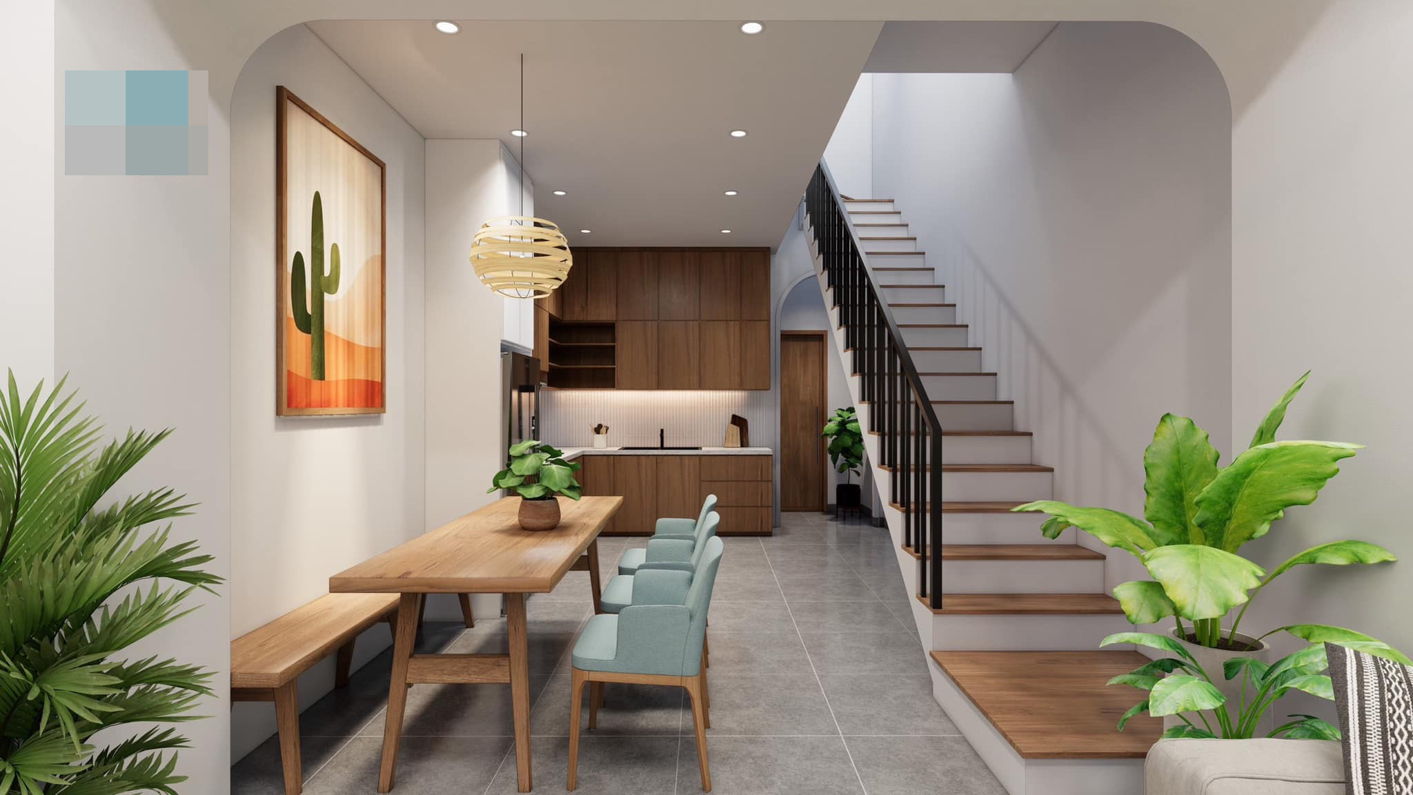 Ngôi nhà 2 tầng sử dụng không gian mở, cho gia chủ tương tác dễ dàng với thiên nhiên. Màu xanh mát dịu làm không gian tràn ngập sức sống.
