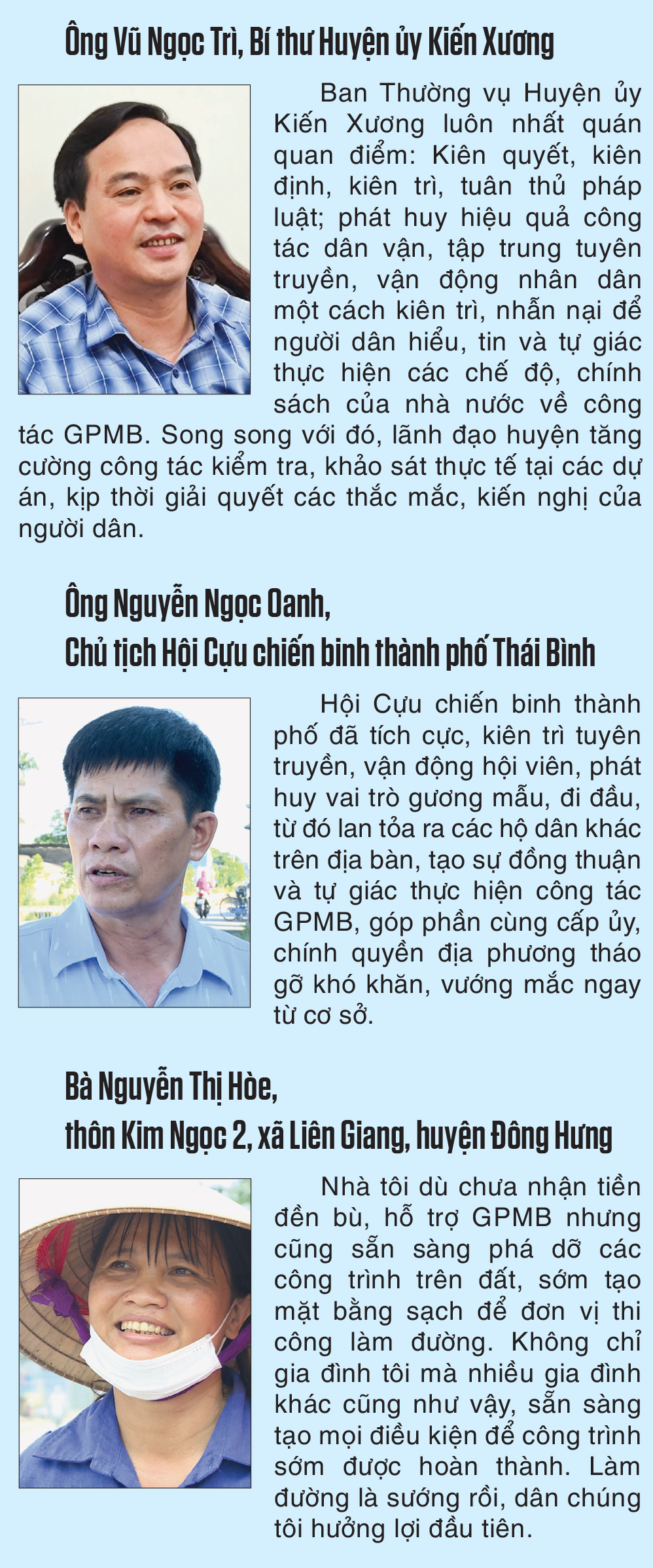 Ông Trần Hữu Nam, Bí thư Huyện ủy Hưng Hà nhận định: Muốn hoàn thành các công trình, dự án đúng tiến độ để thu hút đầu tư, tạo việc làm, nâng cao chất lượng cuộc sống người dân thì việc đầu tiên là phải có mặt bằng sạch. Vì vậy, một trong những nhiệm vụ trọng tâm Ban Chấp hành Đảng bộ huyện Hưng Hà xác định là phải làm tốt công tác đền bù, hỗ trợ GPMB. Ban Thường vụ Huyện ủy Hưng Hà đã ban hành Nghị quyết số 04-NQ/HU về tăng cường sự lãnh đạo, chỉ đạo, thực hiện công tác GPMB phục vụ triển khai các dự án đầu tư trên địa bàn huyện trong tình hình mới. Cùng với đó, các đồng chí Bí thư, Phó Bí thư Huyện ủy, Chủ tịch UBND huyện thường xuyên về họp với các thôn, lắng nghe ý kiến cán bộ, đảng viên, nhân dân để đề ra phương án kịp thời tháo gỡ vướng mắc. Đồng thời, phát huy vai trò của chi bộ, các đoàn thể và từng đảng viên vào cuộc một cách thực chất. Lấy tuyên truyền, vận động, giải thích làm chính để GPMB nhưng luôn cương quyết với những hành vi sai trái, cố tình chây ỳ, không phối hợp trong công tác GPMB, ảnh hướng đến lợi ích chung.