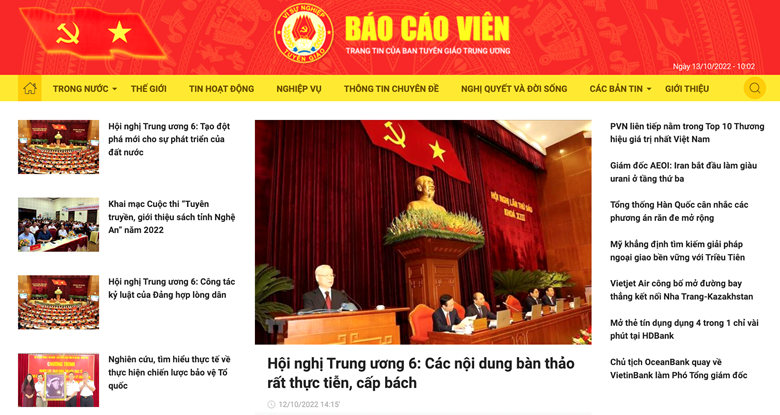 Ngày 13/10, tại Hà Nội, Ban Tuyên giáo Trung ương tổ chức Lễ khai trương Trang thông tin điện tử tổng hợp Báo cáo viên.