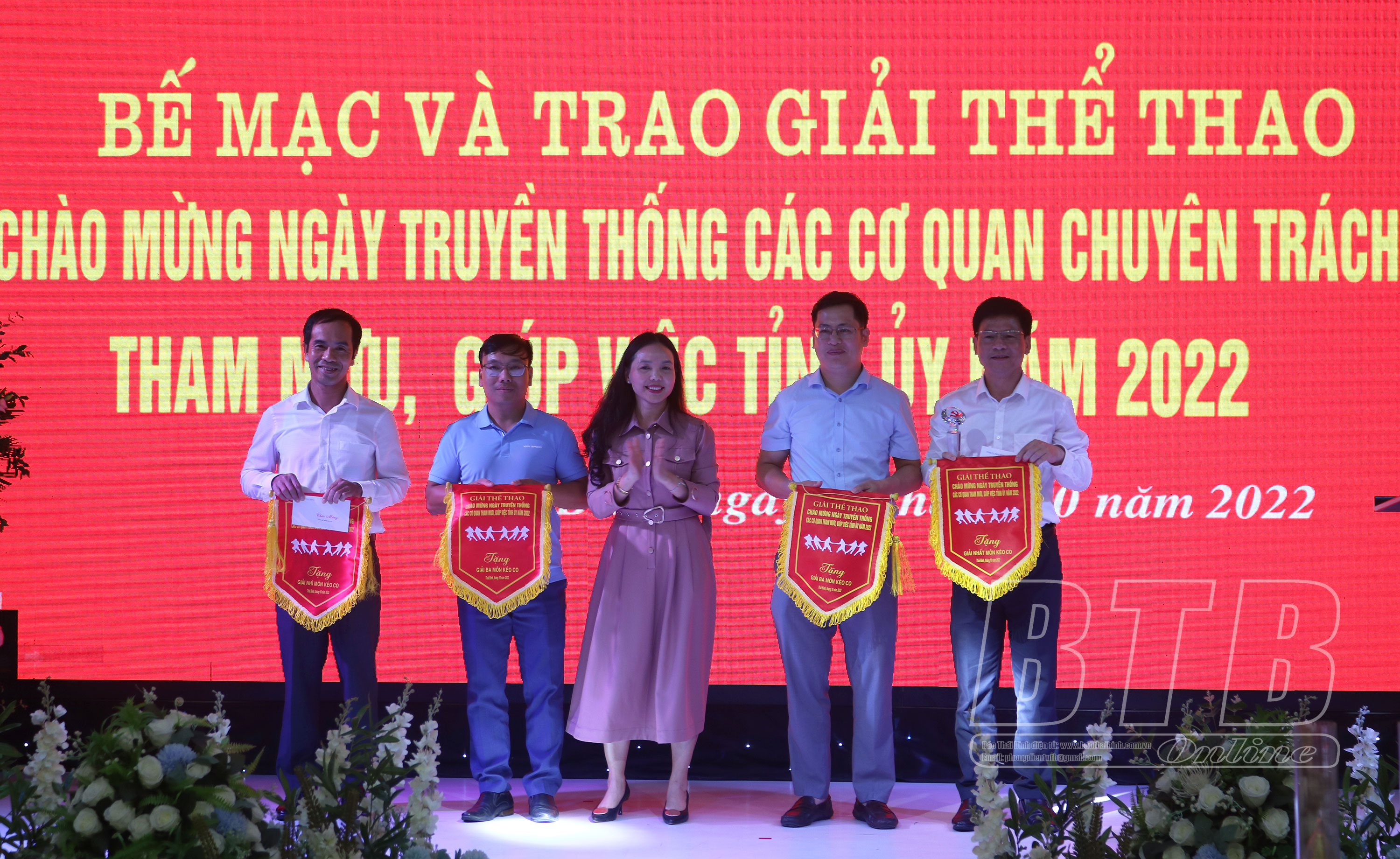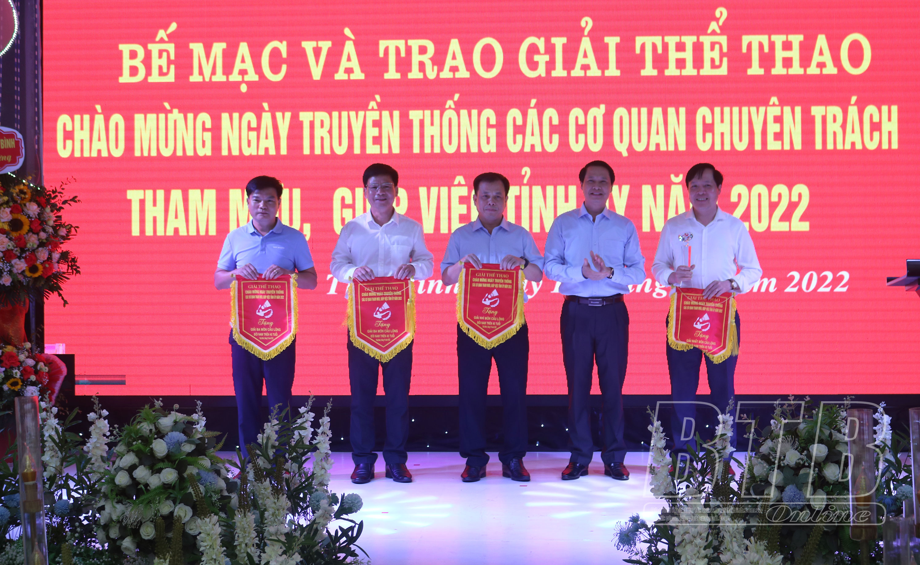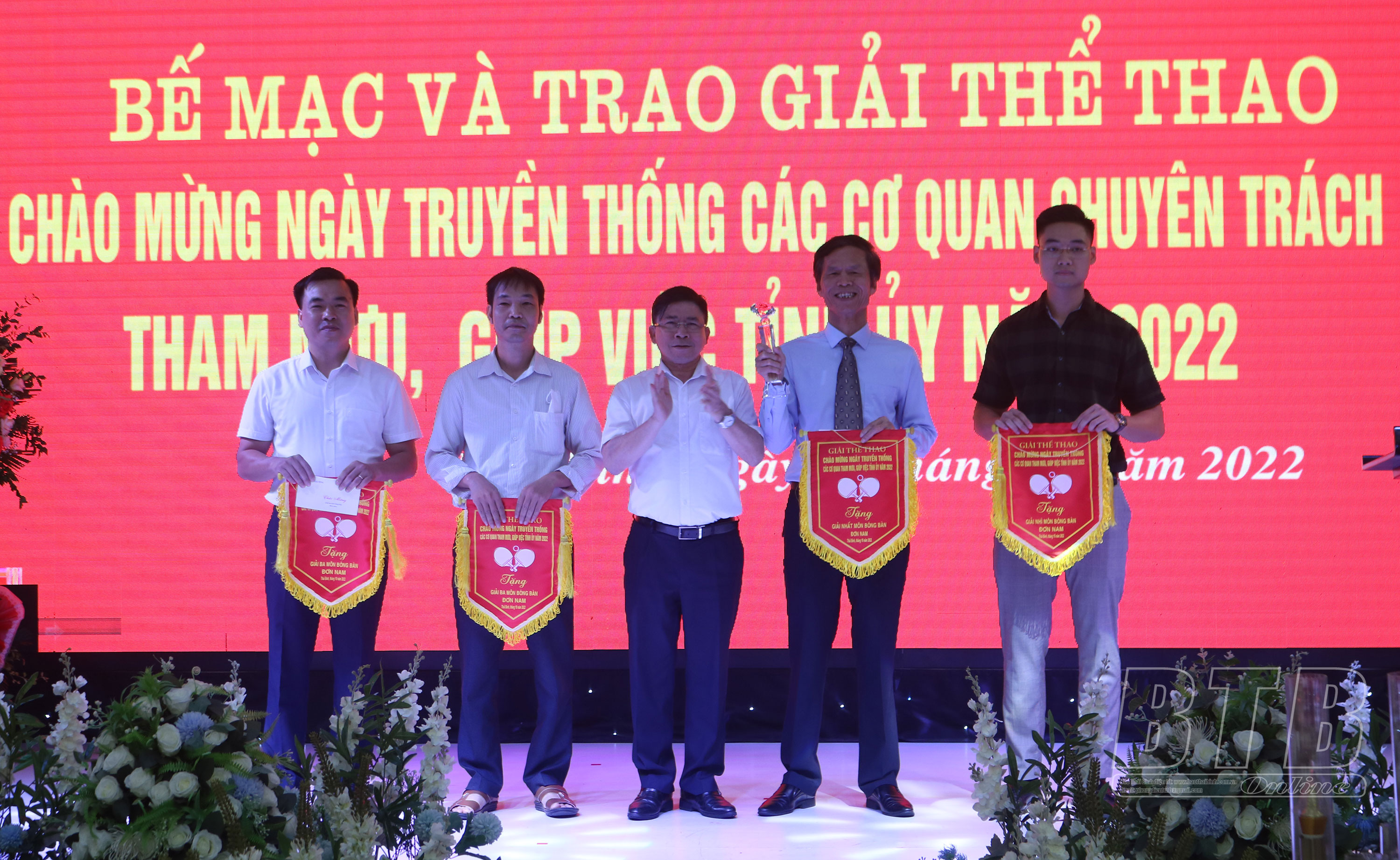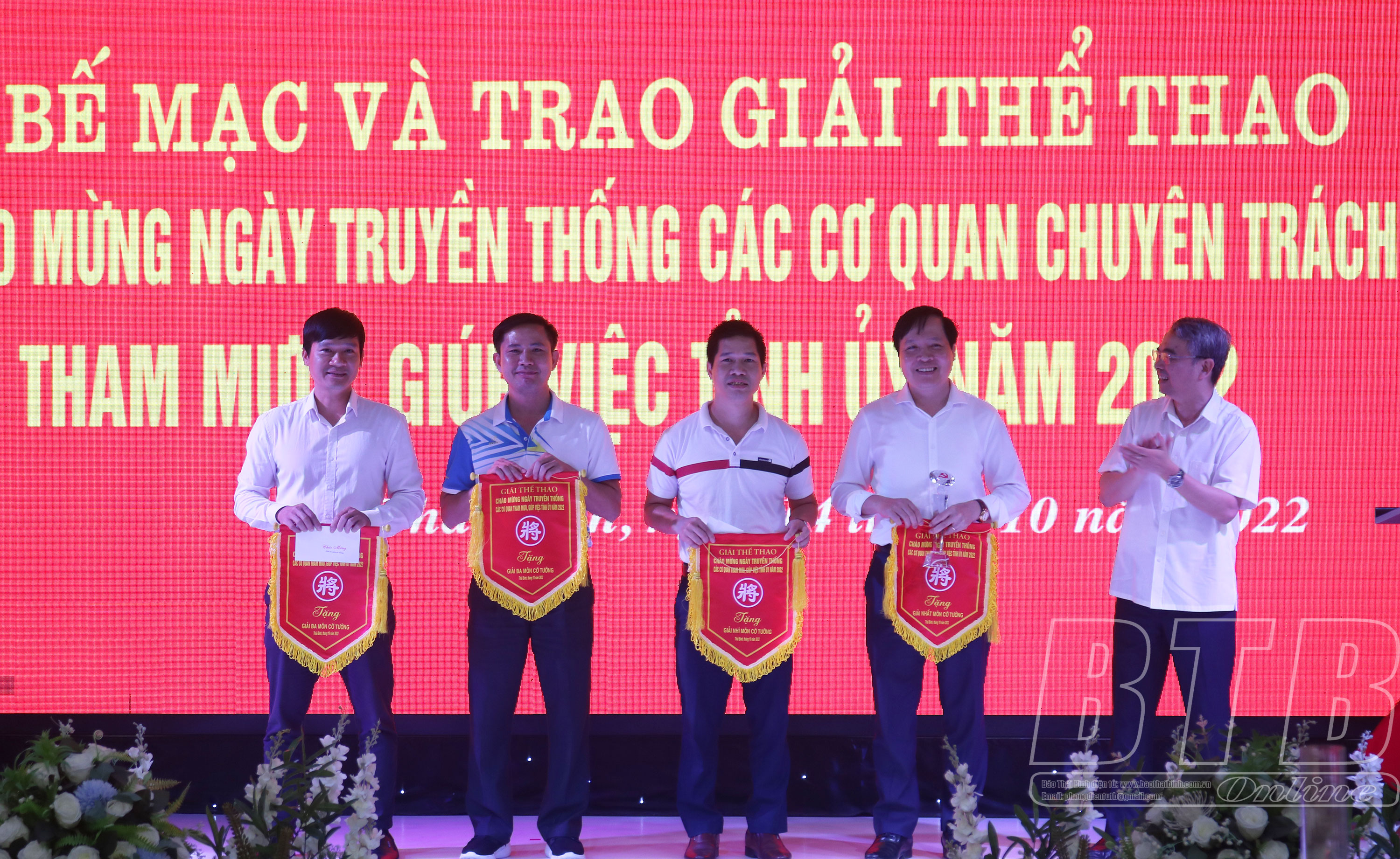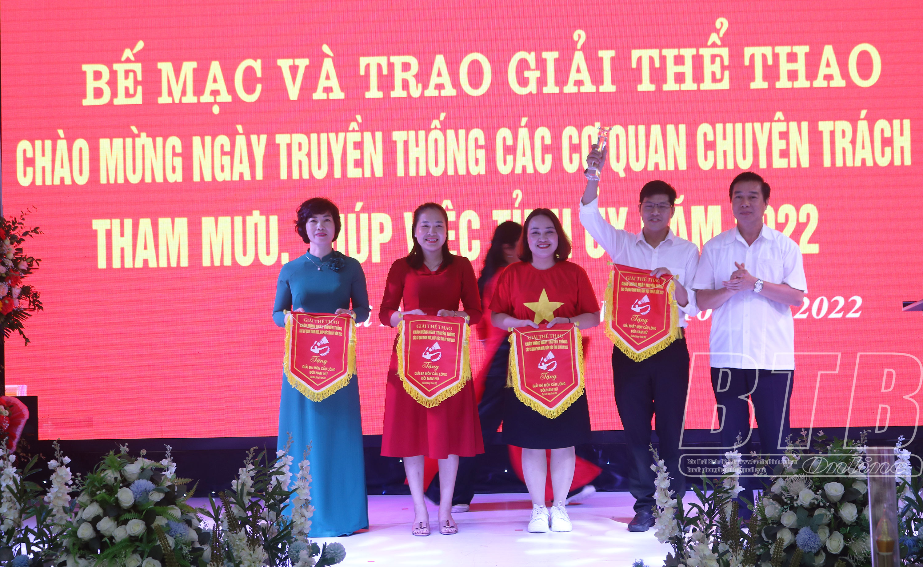 Nhân dịp này, Ban tổ chức các hoạt động văn nghệ, thể thao chào mừng ngày truyền thống các cơ quan chuyên trách tham mưu, giúp việc Tỉnh ủy năm 2022 đã trao giải cho các đội đạt giải nhất, nhì, ba của các bộ môn thi đấu tại giải thể thao chào mừng ngày truyền thống các cơ quan chuyên trách tham mưu, giúp việc Tỉnh ủy.