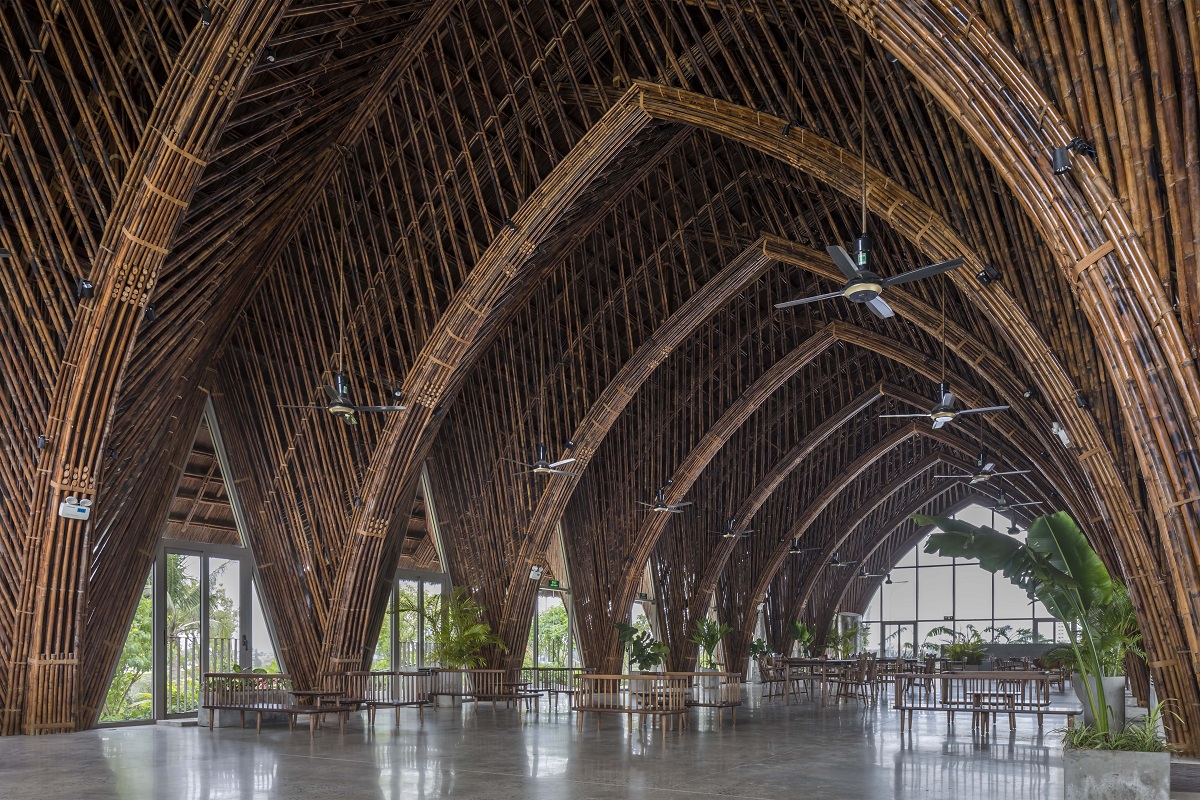 Kết cấu tre cao gần 9m bao gồm 22 khung vòm là cột và giàn mái kết hợp với hệ thống giằng ngang.