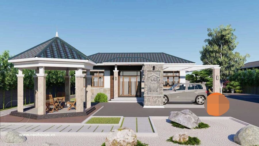 Nhà cấp 4 mái Thái sử dụng hệ thống trụ cột tròn đẹp mắt cùng khuôn viên sân vườn xanh mát.