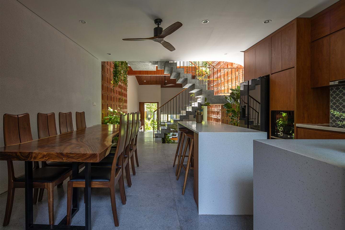 Giải pháp lệch tầng kết hợp với việc đảo vế thang giúp tạo nên các khoảng giếng trời lớn, nhỏ với những mảng cây xanh len lỏi trên mọi tầng bậc.