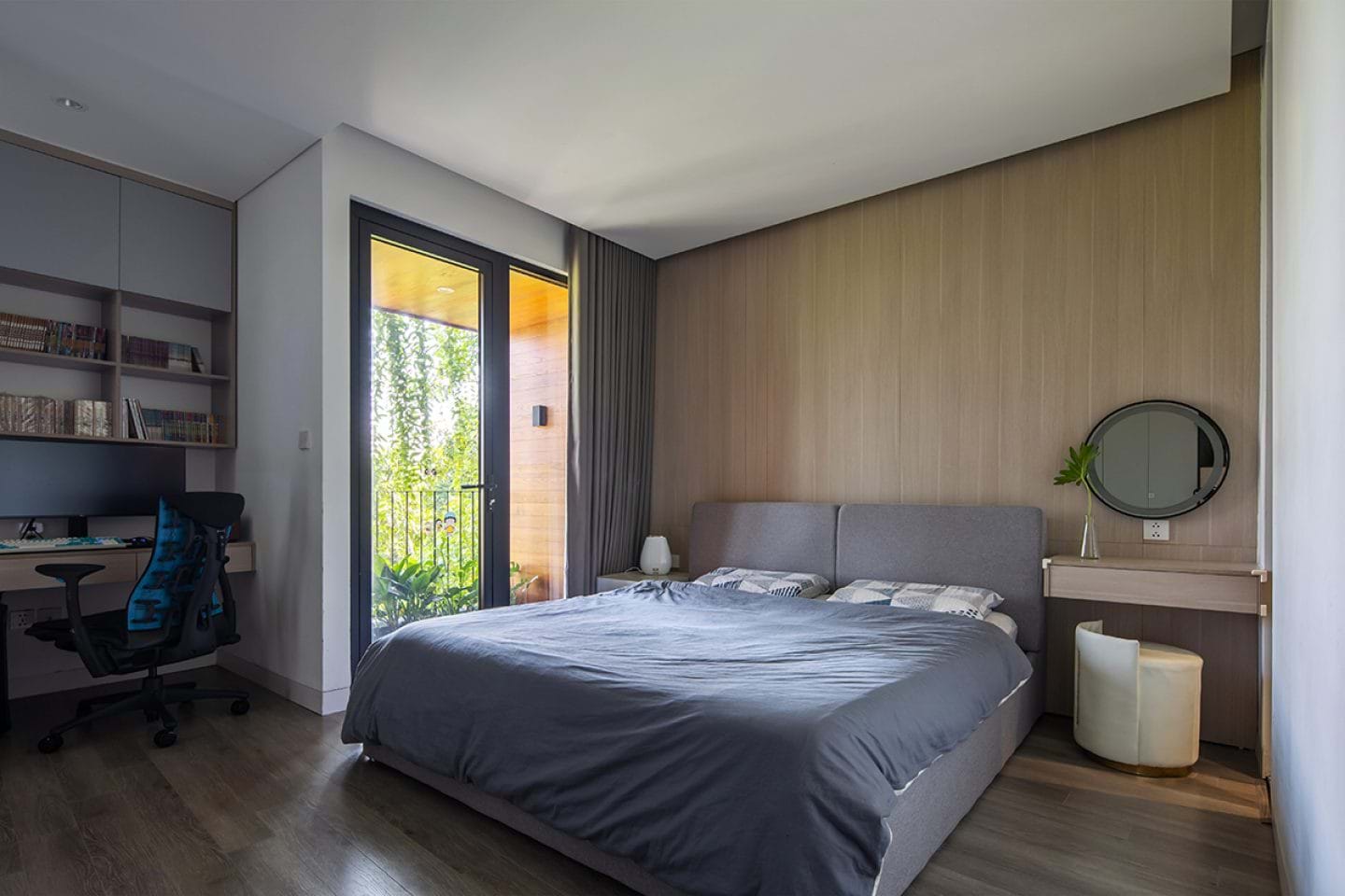 Khi quan sát từ bên ngoài, ngôi nhà trông khá kín đáo và riêng tư. Những mảng tường đặc kết hợp khoảng lùi cây xanh giúp hạn chế tác động của nắng hướng Tây Nam. Đồng thời cũng giảm thiểu tối đa lượng khói bụi và tiếng ồn từ bên ngoài vào.