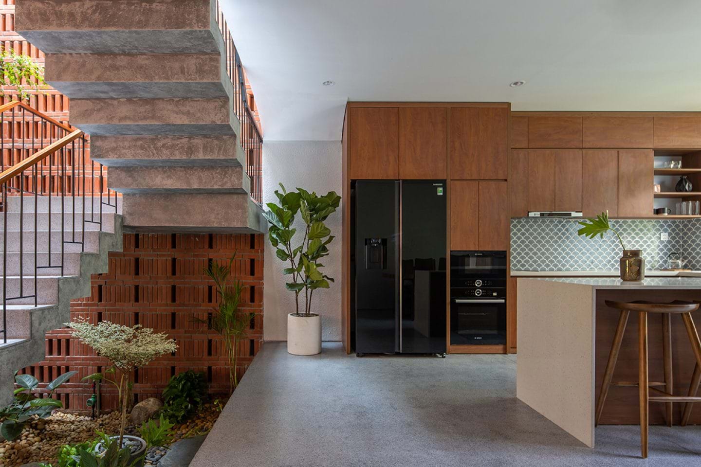 Bước vào không gian bên trong, ngôi nhà nổi bật bởi mảng tường gạch đỏ cùng cây xanh tô điểm.