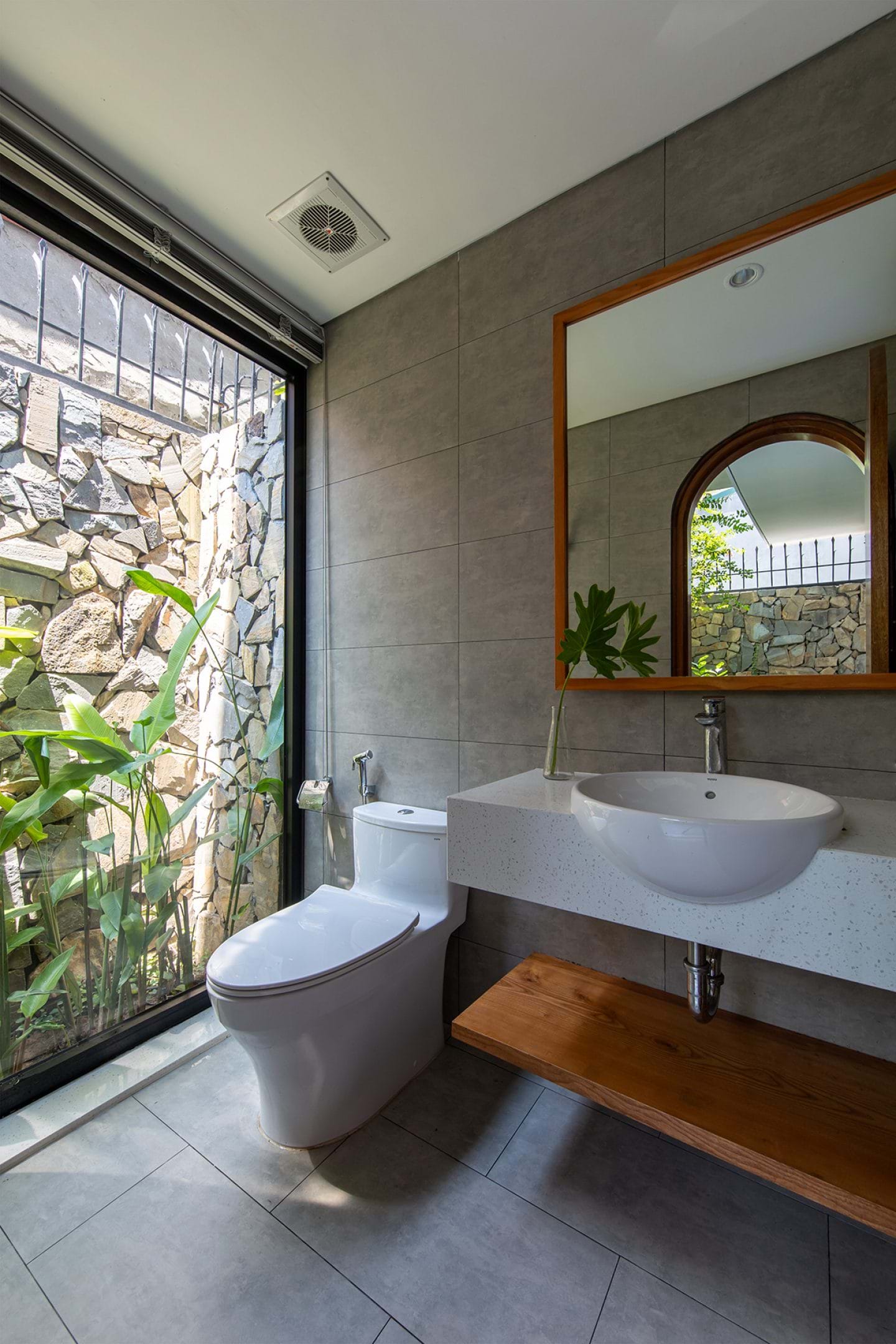 Việc sử dụng bê tông, gạch mộc kết hợp với một số vật liệu tự nhiên như đá, gỗ cùng cây xanh mang lại hơi thở nhiệt đới cho công trình.