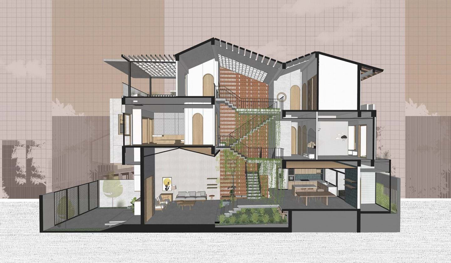 Folding House phát triển khoảng thông tầng và khu vườn xuyên suốt chiều đứng của ngôi nhà, giúp đối lưu không khí và điều hòa vi khí hậu hiệu quả hơn. Thiết kế này cũng làm tăng tính kết nối giữa các thành viên trong gia đình, giữa con người và tự nhiên một cách hài hòa nhất.