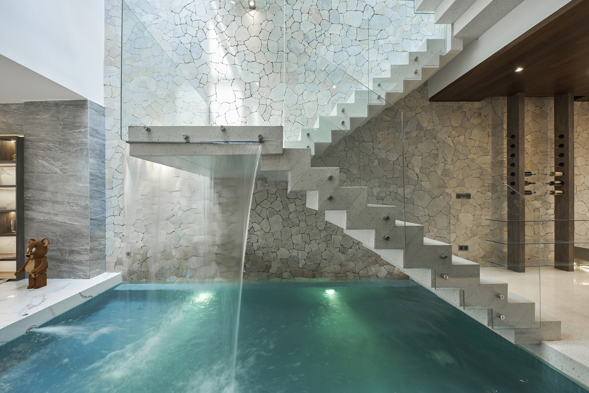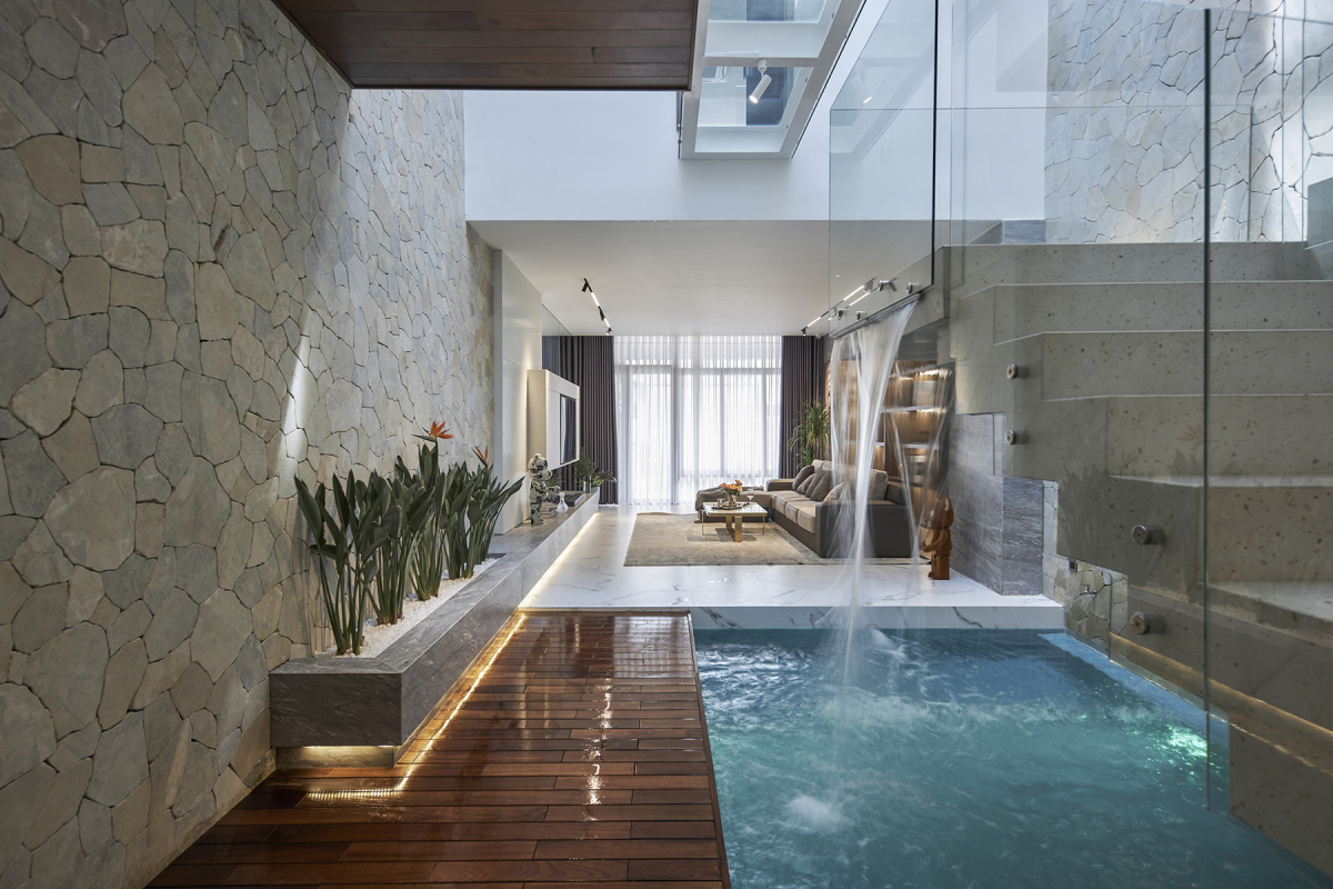 Tường đá rối kéo dài từ khu thông tầng cùa hồ bơi, bếp ăn lên đến mái lấy sáng và phòng thờ phía trên cùng. Sự xuất hiện của mảng tường đã hòa nhập được với khung cảnh thiên nhiên như thác nước, cây cối phía trong ngôi nhà.