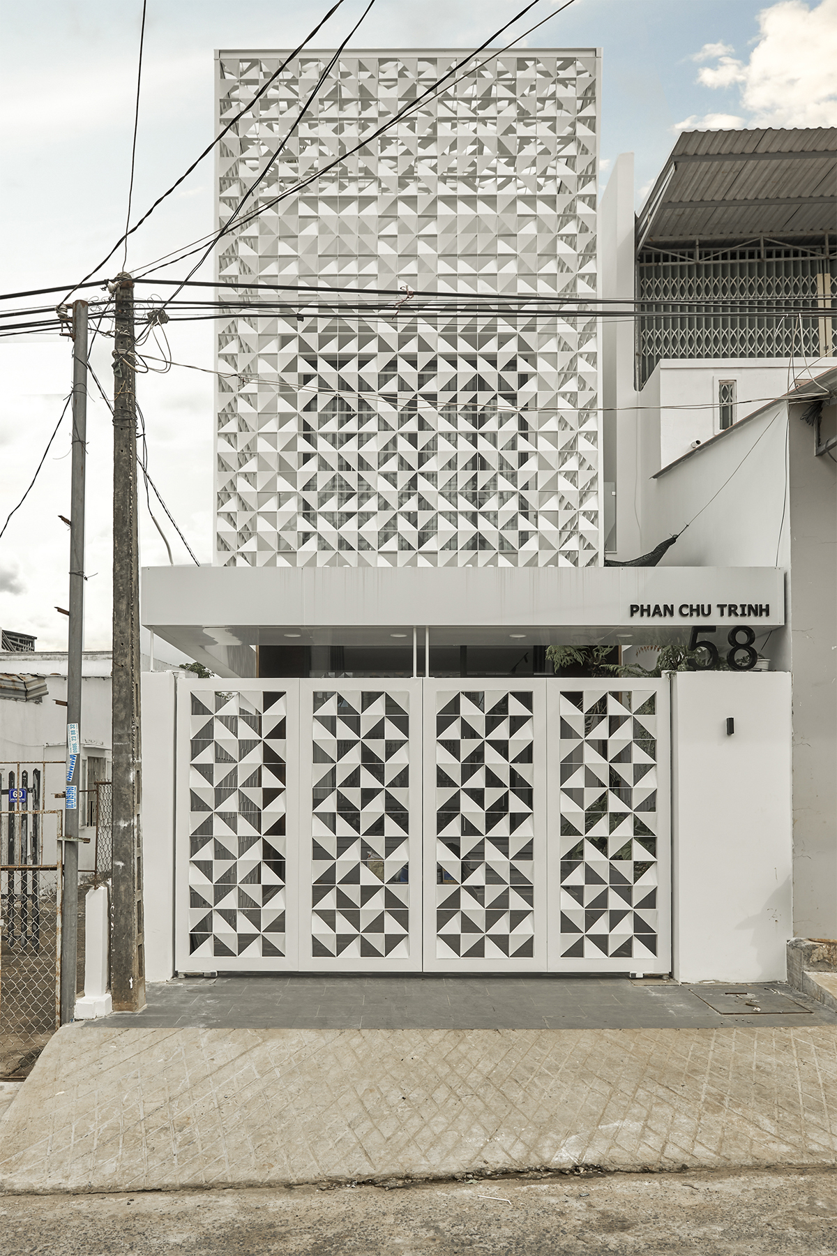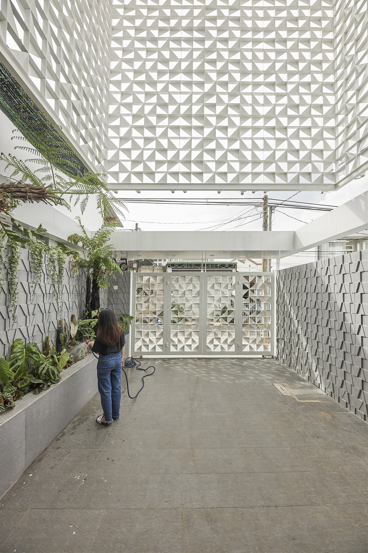 Ngay từ mặt tiền, căn nhà đã gây ấn tượng mạnh về thị giác bởi bên ngoài được bao phủ hệ lam thép sơn tĩnh điện với các họa tiết tam giác ngẫu nhiên, vừa tạo thẩm mỹ kiến trúc, vừa có tác dụng che chắn tầm nhìn từ phía ngoài. Để phù hợp với tổng thể mặt tiền, hai bức tường ngoài sân được sử dụng gạch bê tông 3D với họa tiết tam giác tương tự.
