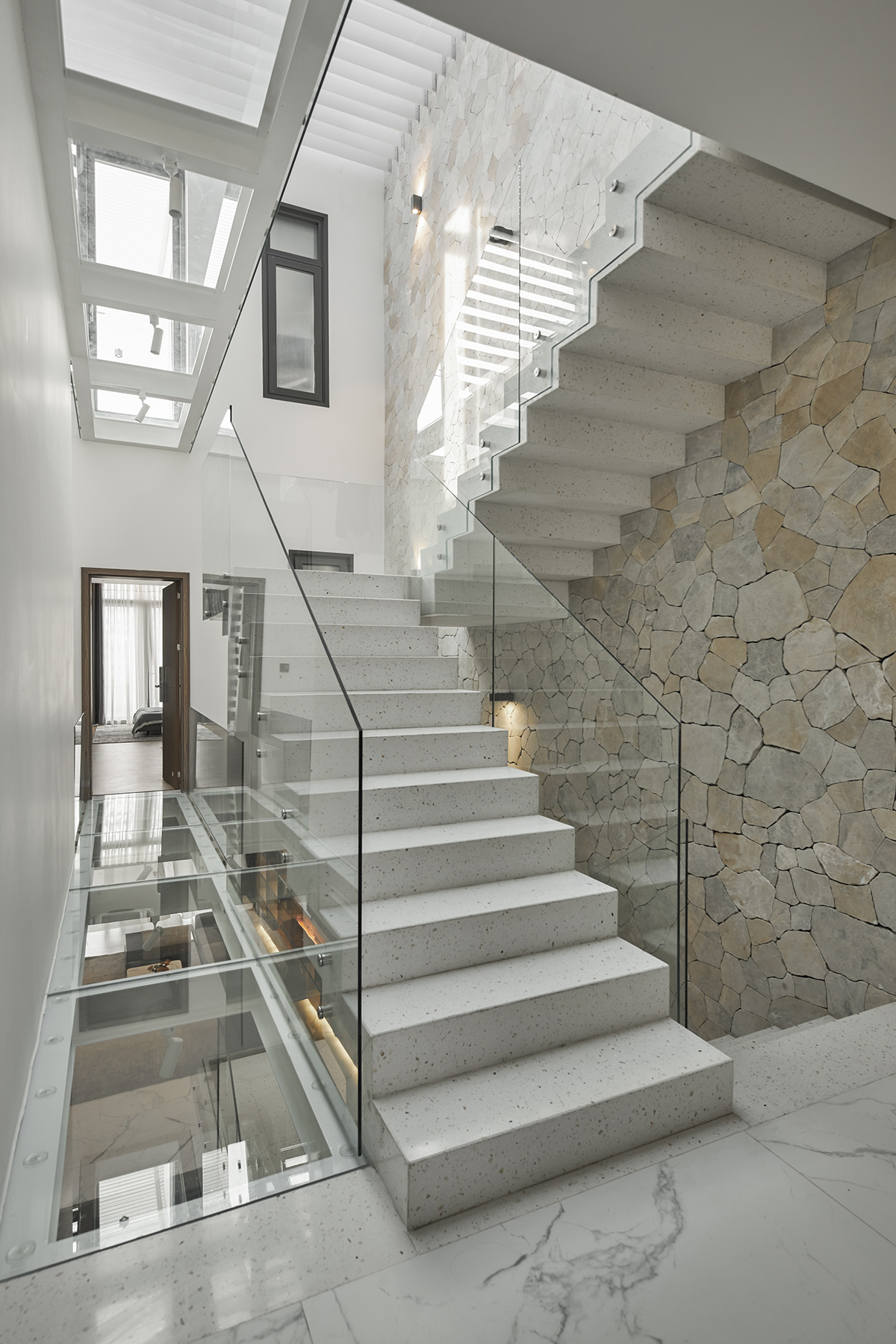 Trong nhà có hai chiếc cầu kính, một ở tầng hai nối phòng ngủ master và cầu thang, chiếc còn lại nối phòng thờ ra sân thượng ở tầng ba. Cầu kính làm bằng kính cường lực nên có thể di chuyển bình thường phía trên. Ngoài tác dụng giao thông, cầu kính còn giúp đưa ánh sáng thiên nhiên từ giếng trời trên mái xuyên thấu xuống các phòng công năng phía dưới.