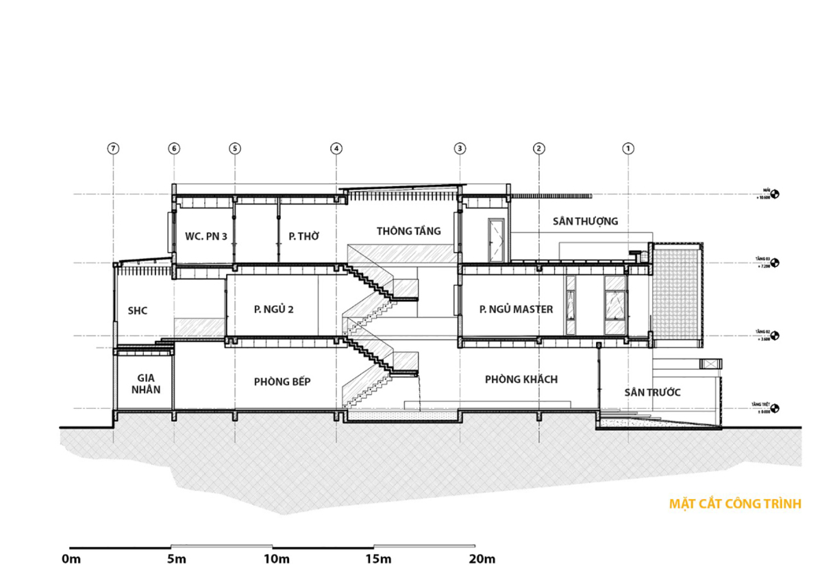 Khu đất với chiều dài 30m tạo cảm giác hẹp và tối, bởi vậy giải pháp nội thất là tạo khoảng thông tầng lớn giữa nhà. Thông tầng giúp điều hòa luồng không khí và chiếu sáng tự nhiên cho toàn bộ công trình.