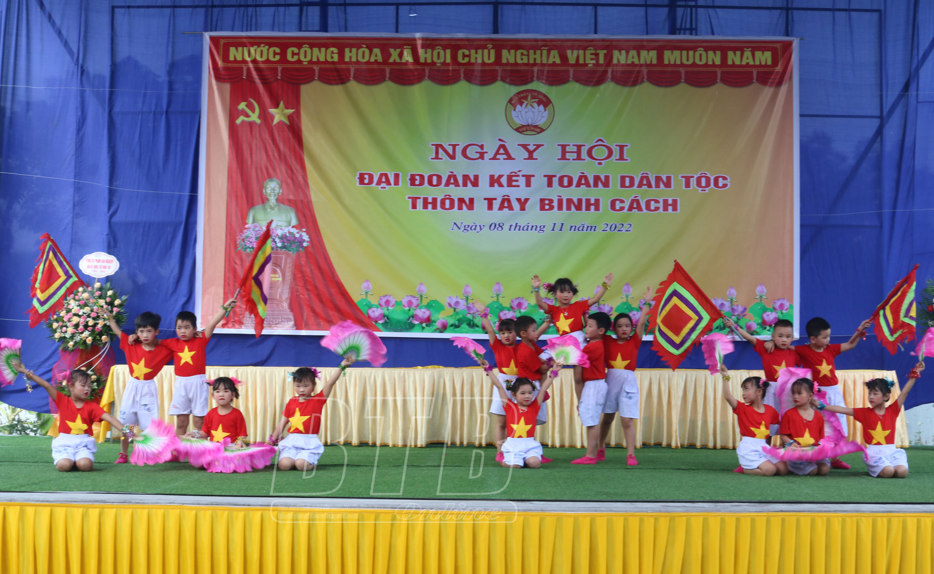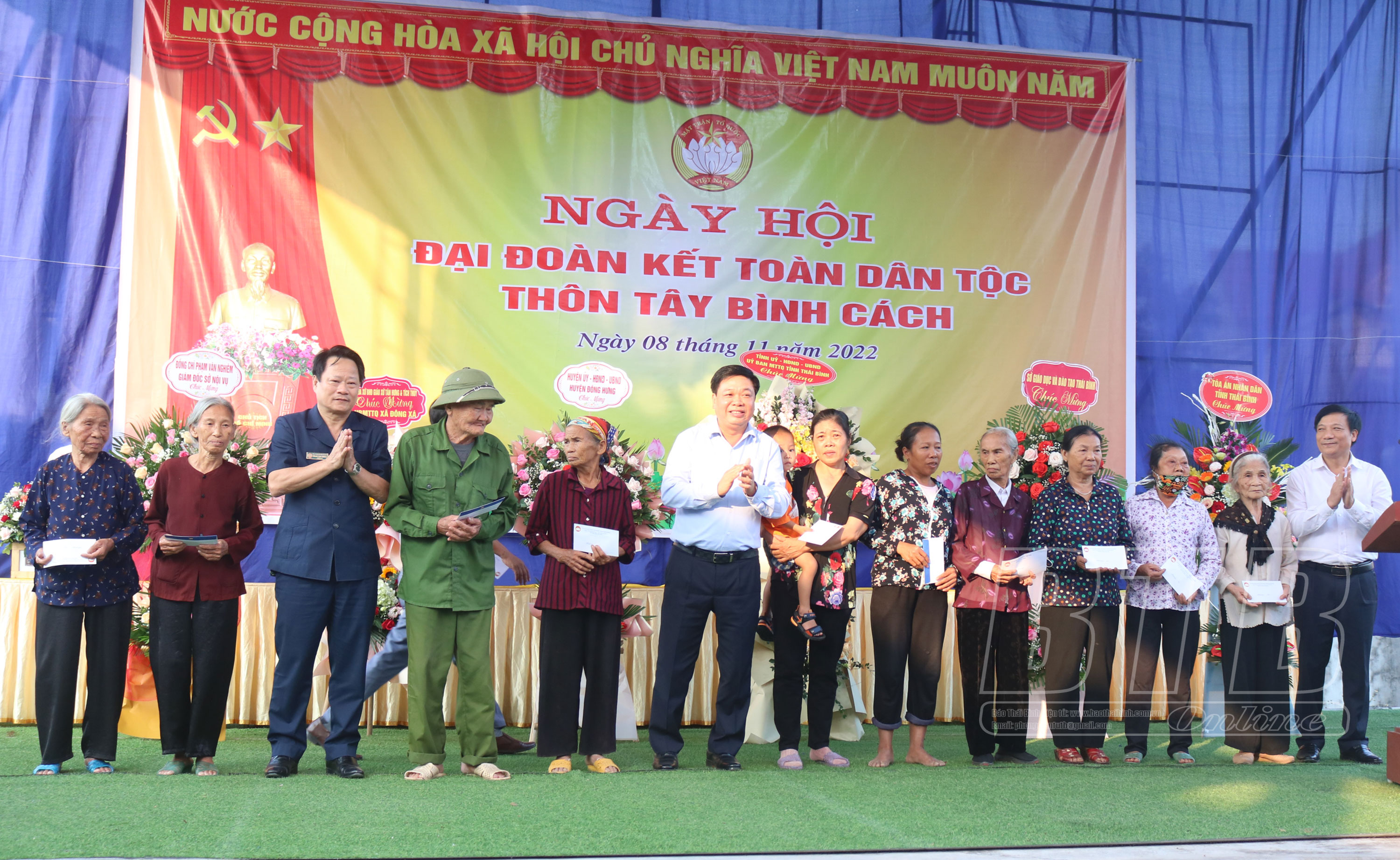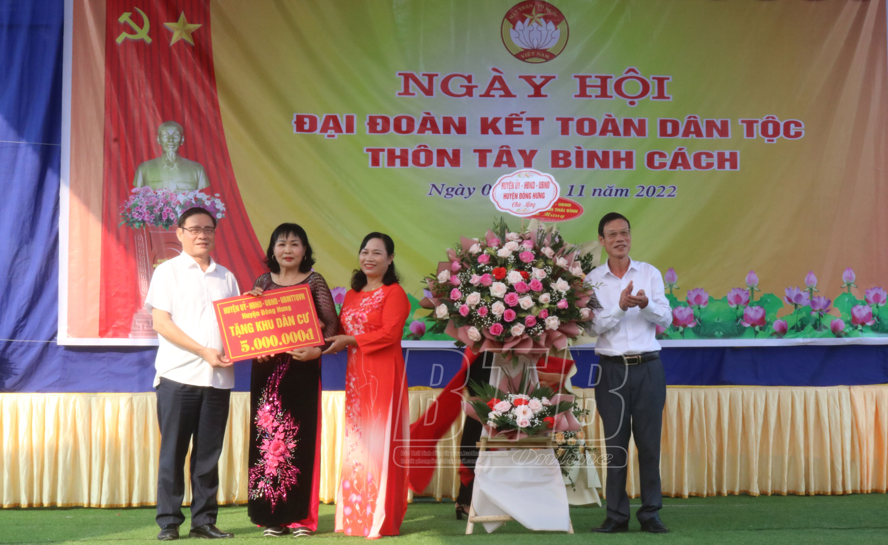 Các đồng chí lãnh đạo tỉnh trao quà cho các hộ nghèo, hộ có hoàn cảnh khó khăn thôn Tây Bình Cách. Các đồng chí lãnh đạo huyện Đông Hưng tặng hoa và trao quà cho nhân dân thôn Tây Bình Cách. Tiết mục văn nghệ chào mừng ngày hội.