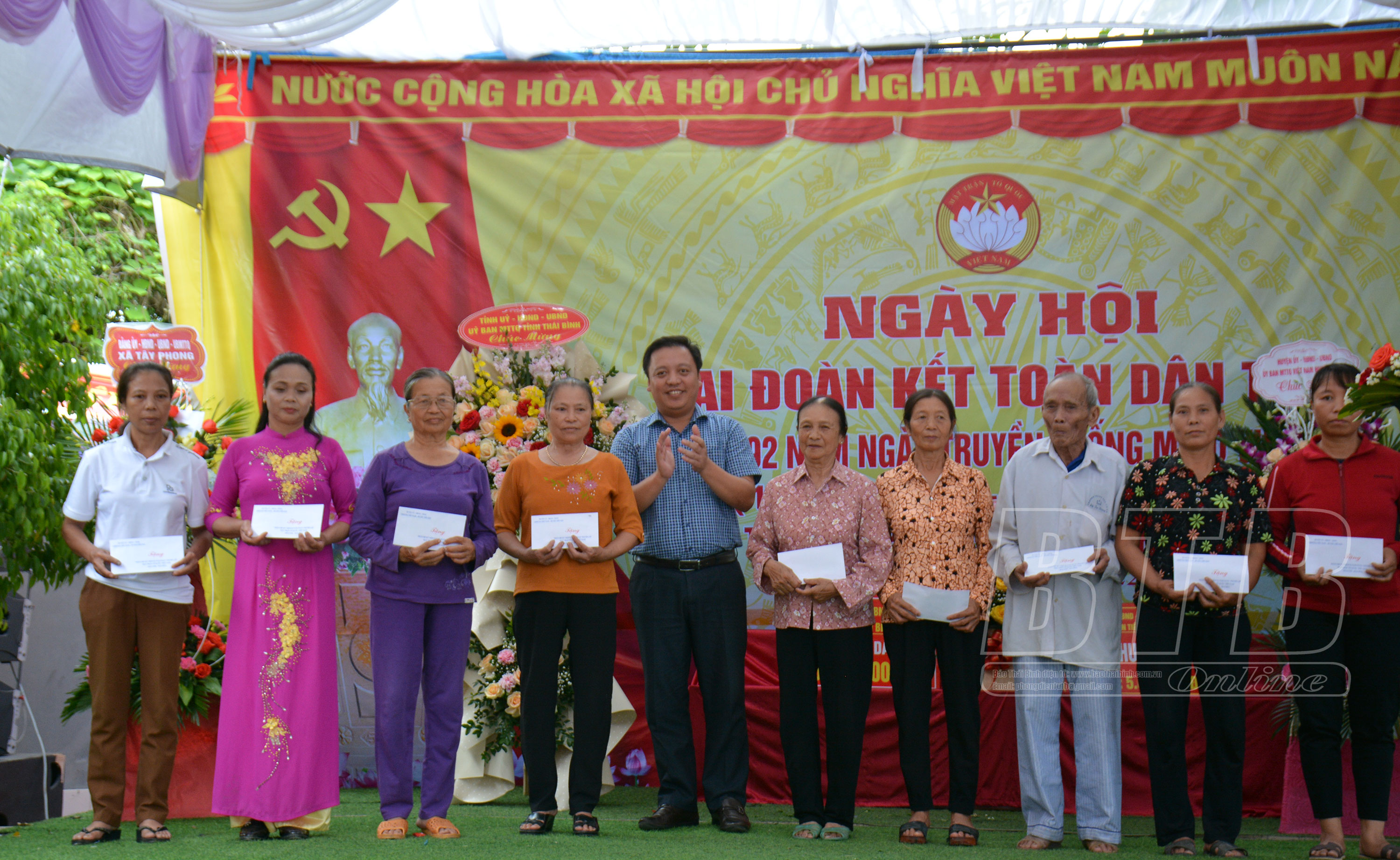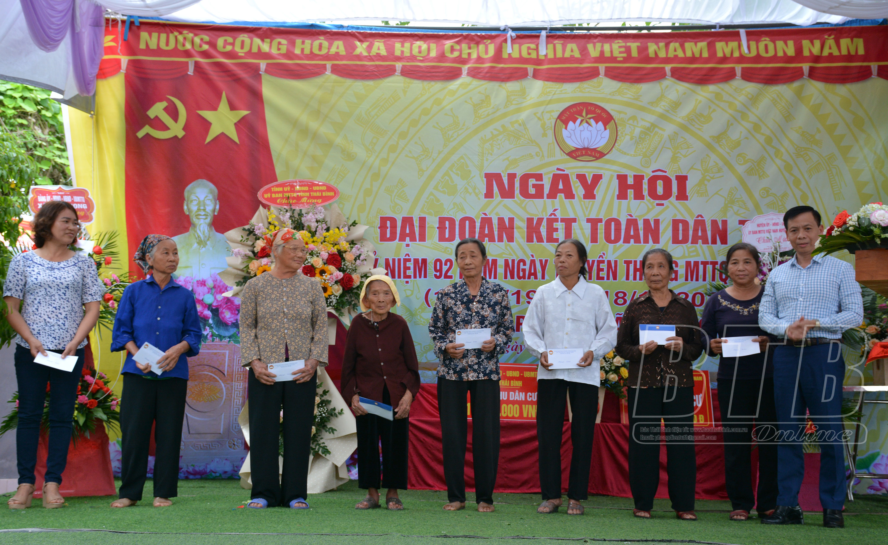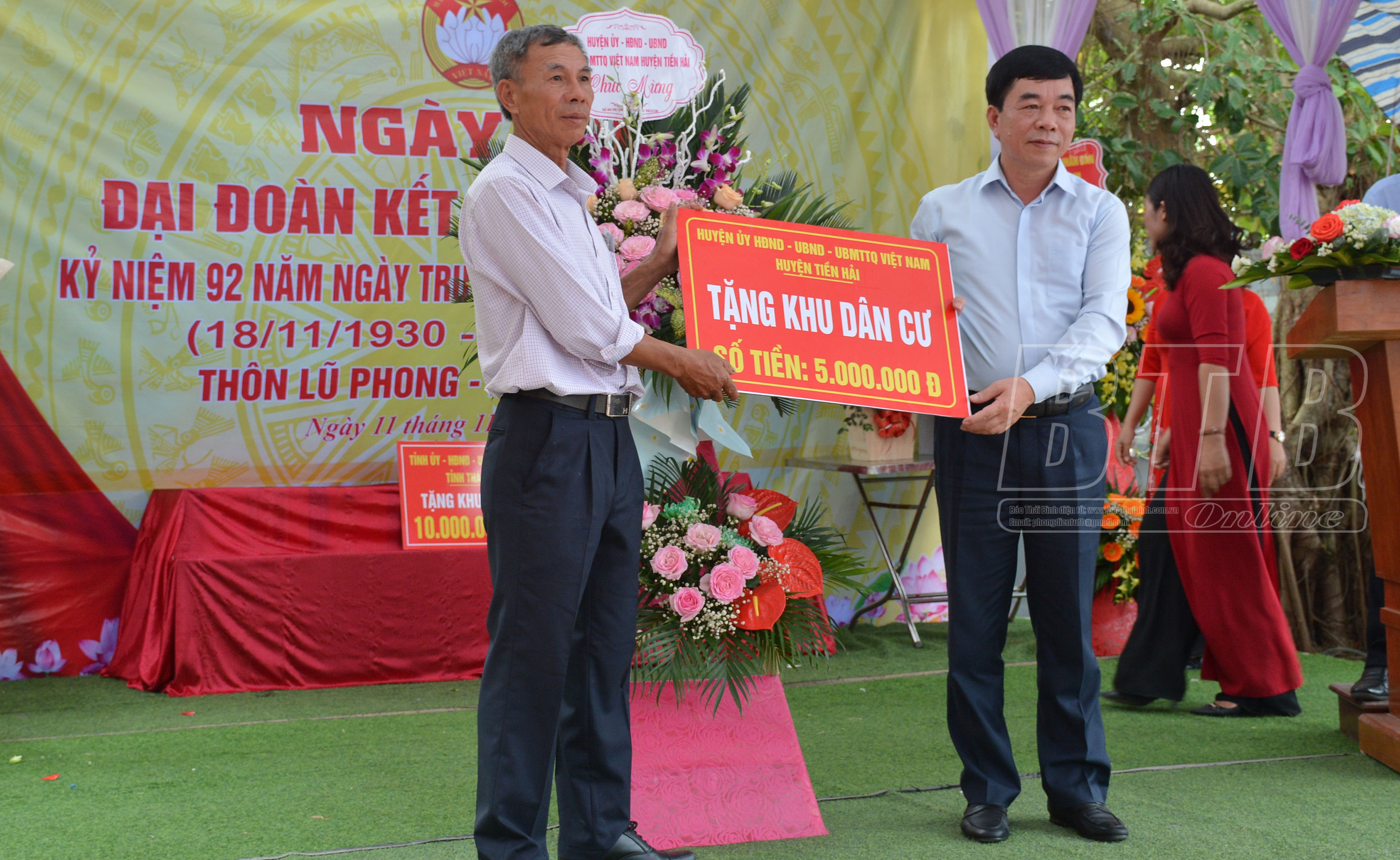 Nhân dịp này, các đồng chí lãnh đạo tỉnh, Ủy ban MTTQ tỉnh, huyện Tiền Hải và các mạnh thường quân đã trao quà cho thôn, các gia đình chính sách, hộ nghèo, hộ có hoàn cảnh khó khăn; các tập thể, cá nhân tiêu biểu trong thực hiện cuộc vận động “Toàn dân đoàn kết xây dựng nông thôn mới, đô thị văn minh” được khen thưởng.