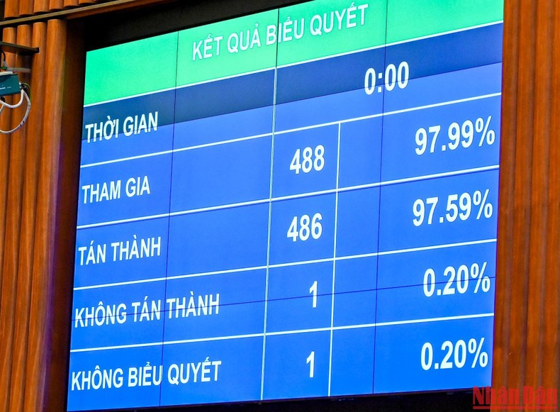 Kết quả biểu quyết điện tử tại phiên họp cho thấy có 486 đại biểu Quốc hội tán thành thông qua Nghị quyết, chiếm 97,59% tổng số đại biểu.
