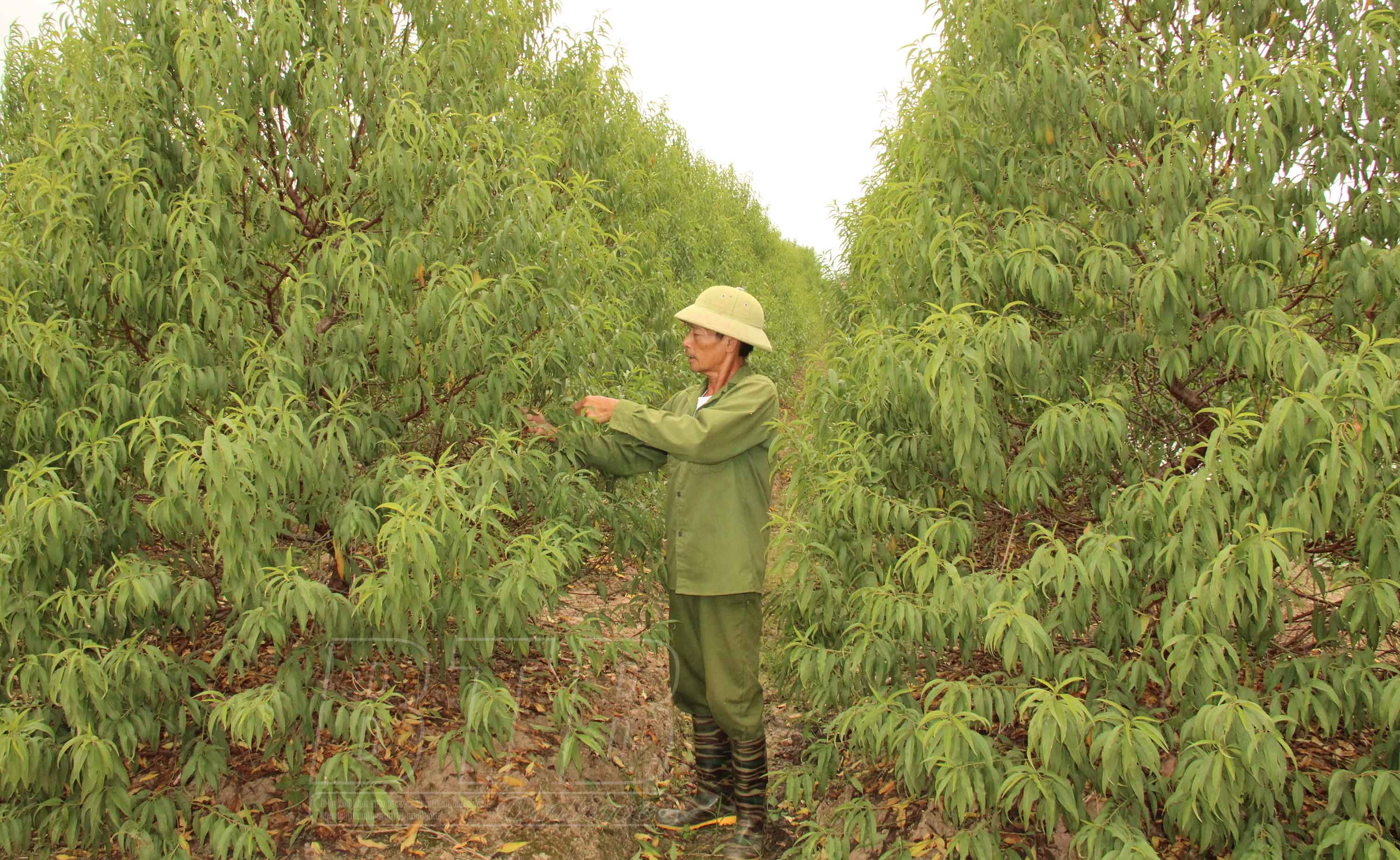Tuốt lá đào phai trước tết Nguyên đán khoảng 70 ngày và tuốt lá đào bích trước tết Nguyên đán khoảng 50 - 60 ngày là cách mà ông Nguyễn Đăng Đáng, thôn Hoàng Đức điều chỉnh để đào ra hoa đúng dịp tết. Ông Đáng cho biết: Năm nay dự kiến gần tết mới rét, vì vậy phải tuốt lá đào muộn. Nhà tôi trồng 7 sào đào với 500 cây, trong đó 130 cây đào to bán tết này. Thường chúng tôi tuốt lá làm 2 - 3 lần, tuốt lá ở cành to, cành dài trước, cành ngắn tuốt lá sau đó khoảng 10 ngày để các cành ra hoa đều nhau vì cành dài non thường ra hoa muộn hơn cành ngắn già. Hiện vợ chồng tôi đang tập trung tuốt lá cho những cây đào phai trước, đào bích tuốt sau, đồng thời tỉa cành, loại bỏ những cành khô, chăm sóc cho từng cây đào.