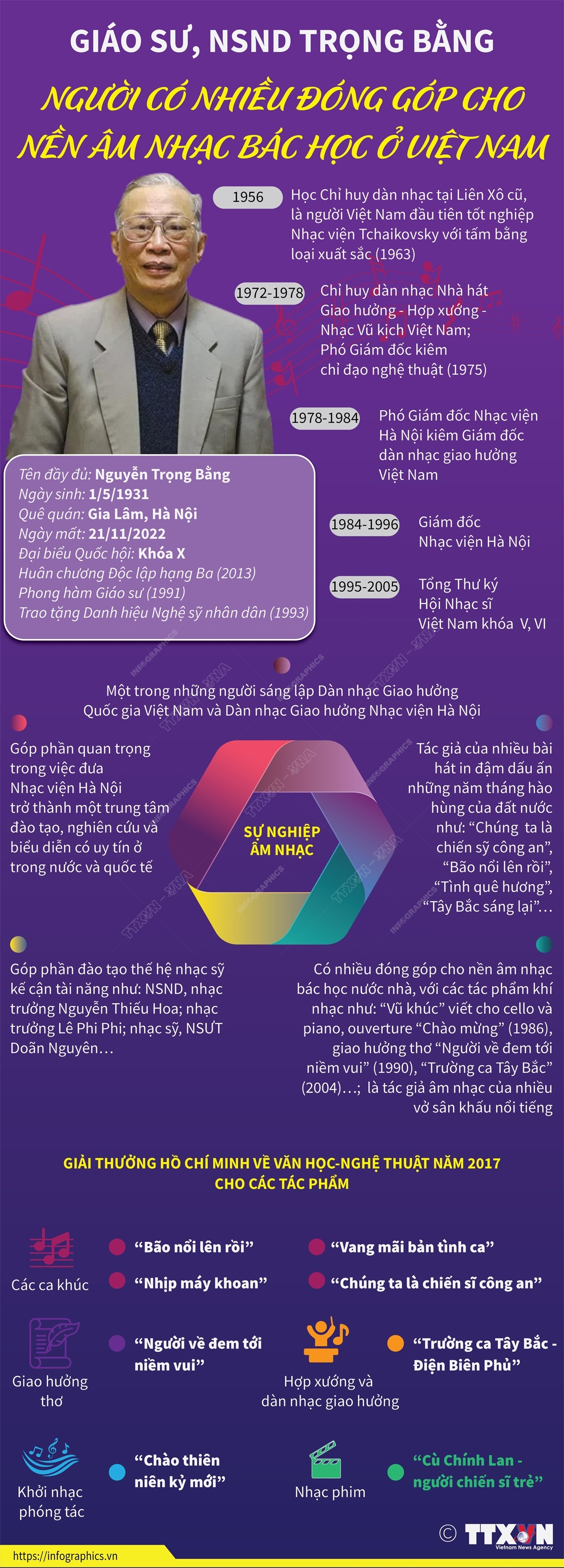 Giáo sư, NSND Trọng Bằng là nhạc sĩ có nhiều đóng góp lớn cho sự nghiệp xây dựng và phát triển nền âm nhạc bác học ở Việt Nam. Ông là nhạc trưởng đầu tiên điều khiển các buổi hòa nhạc giao hưởng nổi tiếng ở TP Hồ Chí Minh sau năm 1975 và là một trong những người sáng lập Dàn nhạc Giao hưởng Quốc gia Việt Nam. Ngoài những đóng góp cho nền âm nhạc bác học, ông đã viết nhiều bài hát in đậm dấu ấn những năm tháng hào hùng của đất nước, là tác giả âm nhạc của nhiều vở sân khấu nổi tiếng. Ông qua đời ngày 21/11/2022, thọ 91 tuổi.
