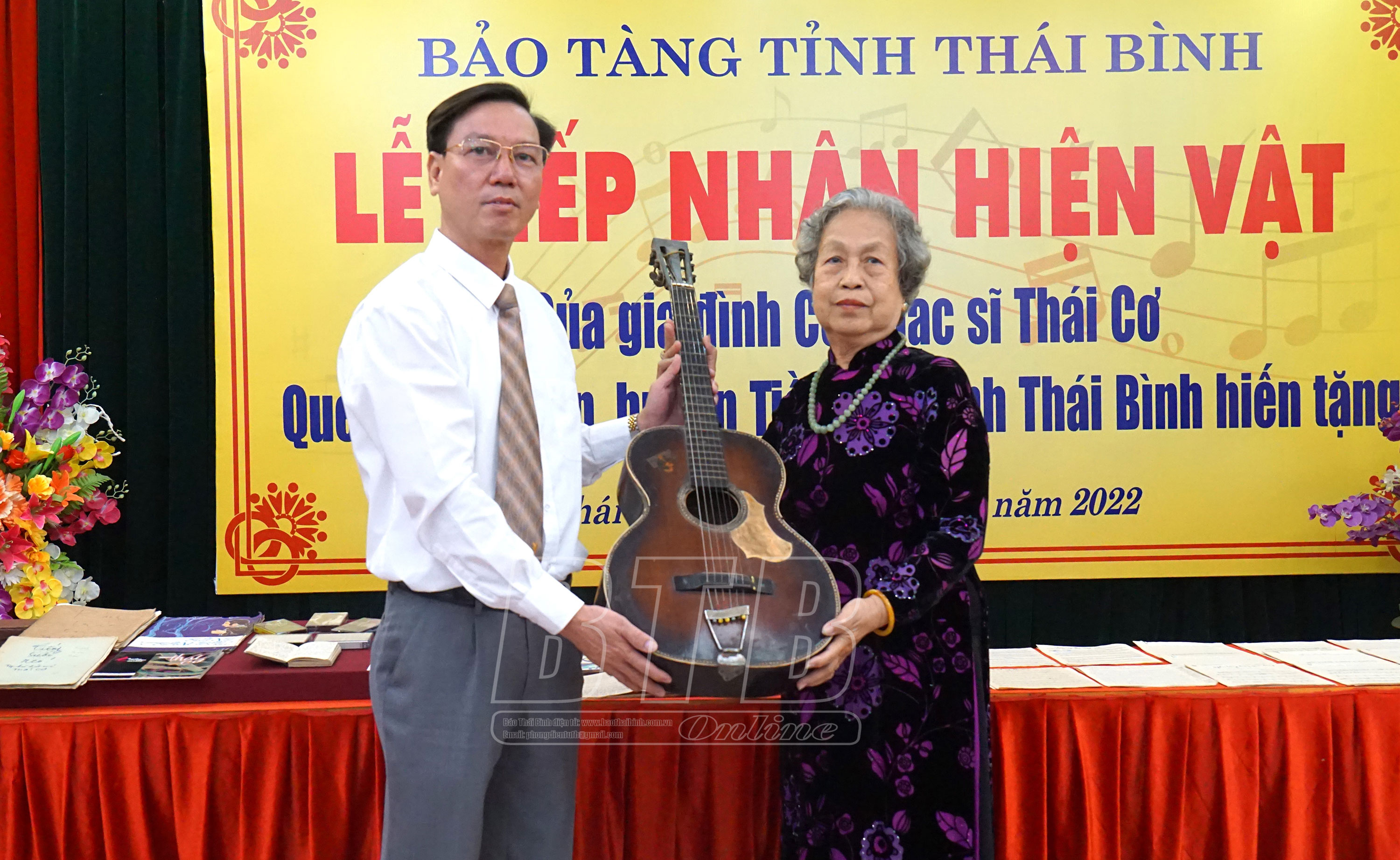 Vợ cố nhạc sĩ Thái Cơ trao tặng hiện vật là cây đàn ghita được cố nhạc sĩ sử dụng trong sáng tác, biểu diễn tại các chiến trường chống Mỹ.Một số tư liệu, hiện vật của cố nhạc sĩ Thái Cơ được trao tặng.