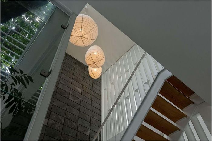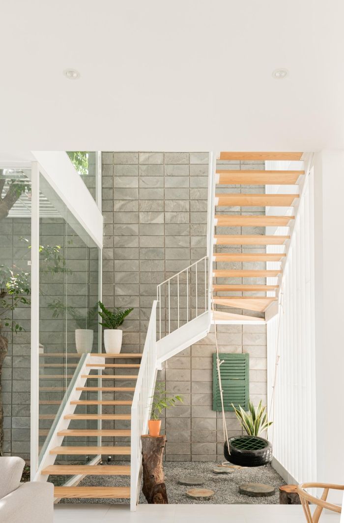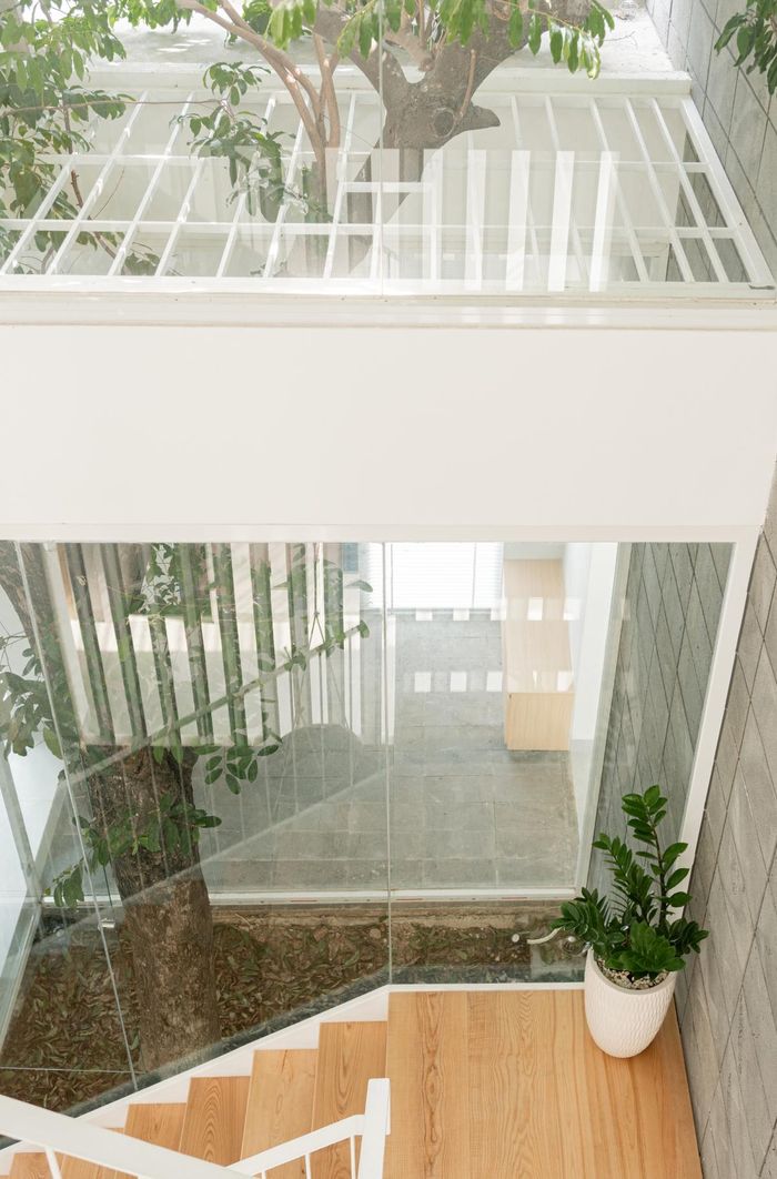 Ở bên trong, các không gian được liên thông với nhau và xoay quanh giếng trời, cầu thang với rất nhiều cây xanh.