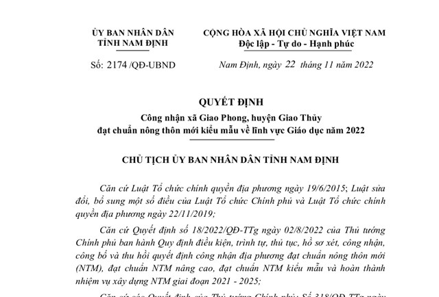 Liên quan Quyết định trên của Chủ tịch UBND tỉnh Nam Định, trước đó, vào ngày 16/11, Giám đốc Sở NN và PTNT tỉnh Nam Định Nguyễn Doãn Lâm đã ký Tờ trình, gửi UBND tỉnh, Chủ tịch UBND tỉnh Nam Định, đề nghị Chủ tịch UBND tỉnh ra Quyết định công nhận xã Giao Phong - huyện Giao Thuỷ đạt chuẩn nông thôn mới kiểu mẫu nổi trội về Giáo dục năm 2022.