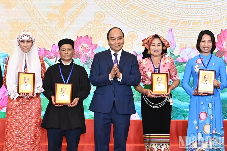 Chủ tịch nước Nguyễn Xuân Phúc, Thường trực Ban Bí thư Võ Văn Thưởng trao bằng khen của Thủ tướng Chính phủ tặng các đại biểu tiêu biểu. (Ảnh: ĐĂNG KHOA).